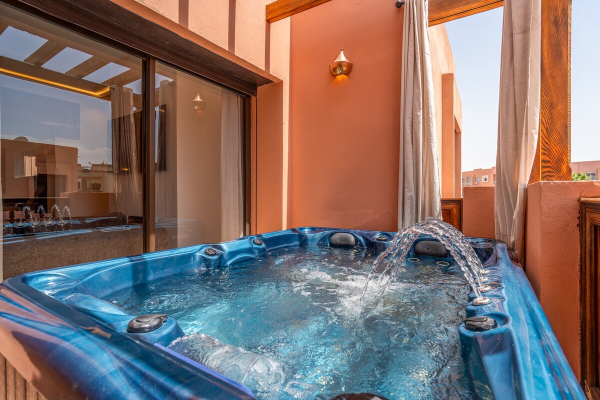 ಈ ಸೊಗಸಾದ 2-ಬೆಡ್ರೂಮ್, 2-ಬ್ಯಾತ್ರೂಮ್ ಅಪಾರ್ಟ್ಮೆಂಟ್ನಲ್ಲಿ ಕನಿಷ್ಠ ವಿನ್ಯಾಸ ಮತ್ತು ಮೊರೊಕನ್ ಸಂಪ್ರದಾಯದ ವಿಶಿಷ್ಟ ಮಿಶ್ರಣವನ್ನು ಅನ್ವೇಷಿಸಿ. ಟೆರೇಸ್ನಲ್ಲಿ ಖಾಸಗಿ ಜಾಕುಝಿ, ಸಂಪೂರ್ಣ ಸುಸಜ್ಜಿತ ಅಡುಗೆಮನೆ ಮತ್ತು ಸೊಗಸಾದ ವಾಸದ ಸ್ಥಳಗಳನ್ನು ಆನಂದಿಸಿ. ಹಂಚಿಕೊಂಡ ಪೂಲ್ ಹೊಂದಿರುವ ಸುರಕ್ಷಿತ ನಿವಾಸದಲ್ಲಿ ನೆಲೆಗೊಂಡಿರುವ ಈ ಸ್ಥಳವು ಮರಕೆಚ್ ಅನ್ನು ಅನ್ವೇಷಿಸಿದ ನಂತರ ವಿಶ್ರಾಂತಿ ಪಡೆಯಲು ಸೂಕ್ತವಾಗಿದೆ. ನಿಮಗೆ ಅಗತ್ಯವಿರುವ ಎಲ್ಲಾ ಸೌಕರ್ಯಗಳೊಂದಿಗೆ ಶಾಂತ, ಆಧುನಿಕ ಹಿಮ್ಮೆಟ್ಟುವಿಕೆ — ಮತ್ತು ಮೊರೊಕನ್ ಆತ್ಮದ ಸ್ಪರ್ಶ.