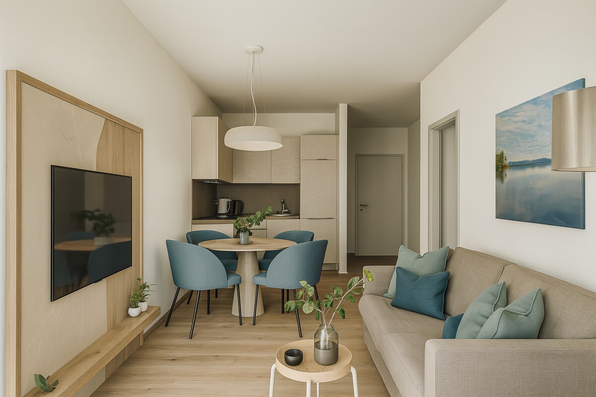 ಸುಂದರವಾದ ಪರ್ವತ ಮತ್ತು ಭಾಗಶಃ ಸರೋವರದ ನೋಟವನ್ನು ಹೊಂದಿರುವ ಆಧುನಿಕ ಅಪಾರ್ಟ್ಮೆಂಟ್