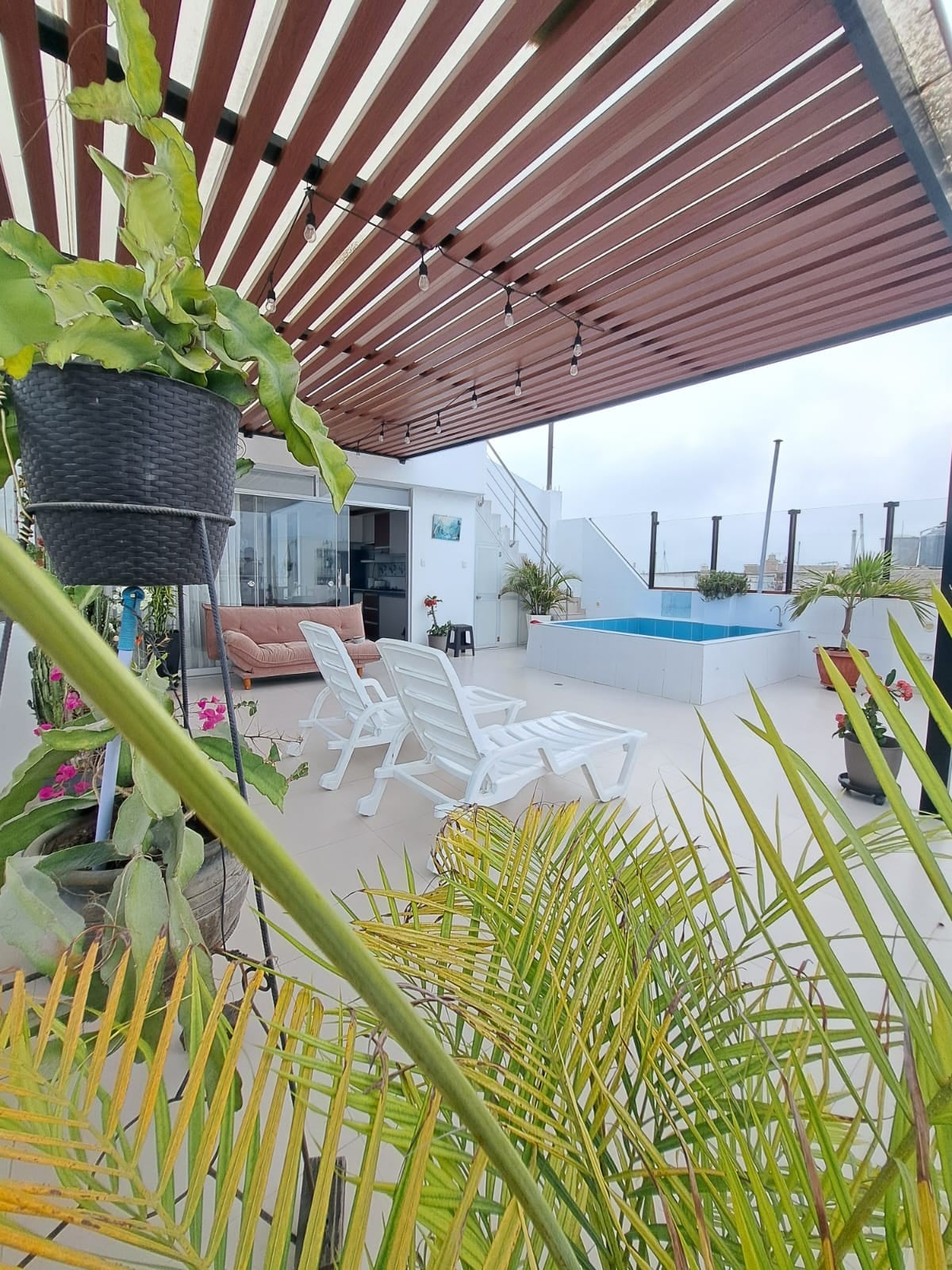 Amplia casa con Piscina en el 4to piso con Hermosa vista del mar de Huanchaco, lugar de ambiente con Parrilla y Horno de Barro, a pocos metros de la Playa. Excelente lugar para reuniones familiares o de amigos Se realisan 15 años o Matrimonios 6 dormitorios y 13 camas ( 2 camarotes, 7 de 2 plazas, 2 de plaza y media).