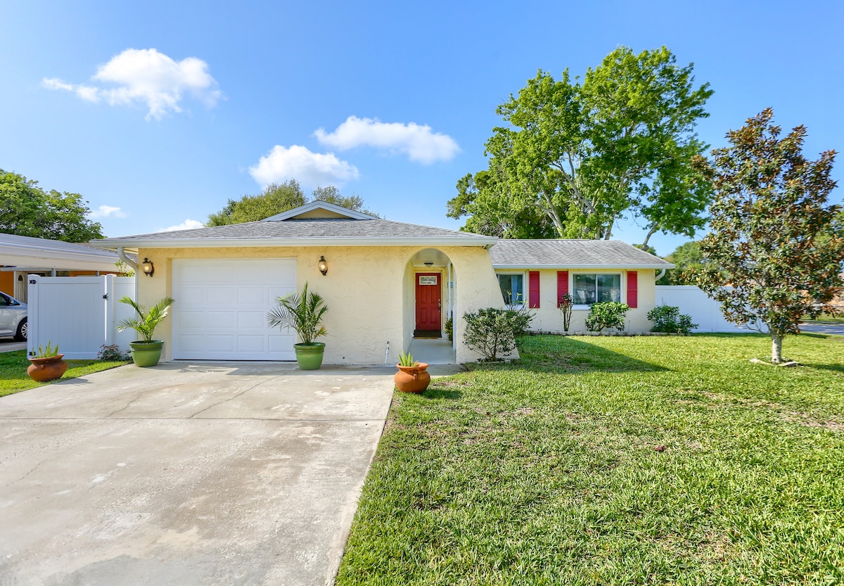 ನಮ್ಮ ಮನೆಯನ್ನು ಸುಂದರವಾಗಿ ನವೀಕರಿಸಲಾಗಿದೆ, ಸಂಪೂರ್ಣವಾಗಿ ಸಜ್ಜುಗೊಳಿಸಲಾಗಿದೆ ಮತ್ತು ಕಡಲತೀರದ ಥೀಮ್ನಲ್ಲಿ ಅಲಂಕರಿಸಲಾಗಿದೆ. ಮಾಸ್ಟರ್ ಬೆಡ್ರೂಮ್ನಲ್ಲಿ ಆರಾಮದಾಯಕವಾದ ರಾಜ ಗಾತ್ರದ ಹಾಸಿಗೆ ಮತ್ತು ಎರಡನೇ ಬೆಡ್ರೂಮ್ನಲ್ಲಿ ರಾಣಿ ಇದ್ದಾರೆ. ನಮ್ಮ ಹಿಂಭಾಗದಲ್ಲಿ ಸುಂದರವಾದ ಕೊಳವಿದೆ. ನಮ್ಮ ಅದ್ಭುತ ಫ್ಲೋರಿಡಾ ಹವಾಮಾನವನ್ನು ಆನಂದಿಸುವಾಗ ನೀವು ವಿಶ್ರಾಂತಿ ಪಡೆಯಲು ಮತ್ತು BBQ ಮಾಡಲು ಸೂಕ್ತವಾಗಿದೆ. ಮನೆಯು ಸ್ಮಾರ್ಟ್ ಟಿವಿ, ಇಂಟರ್ನೆಟ್ ಡಬ್ಲ್ಯೂ/ವೈ-ಫೈ, ಡಿಶ್ವಾಶರ್, ವಾಷರ್, ಡ್ರೈಯರ್ ಮತ್ತು ಹೆಚ್ಚಿನದನ್ನು ಹೊಂದಿದೆ. ನಿಮ್ಮ ವಾಸ್ತವ್ಯವನ್ನು ಪರಿಪೂರ್ಣವಾಗಿಸಲು ನಿಮಗೆ ಅಗತ್ಯವಿರುವ ಎಲ್ಲವೂ. ನಾವು ಉತ್ತಮ ಶಾಪಿಂಗ್, ಊಟ ಮತ್ತು ಫ್ಲೋರಿಡಾದ ಕೆಲವು ಅತ್ಯುತ್ತಮ ಕಡಲತೀರಗಳಿಗೆ ಹತ್ತಿರದಲ್ಲಿದ್ದೇವೆ.