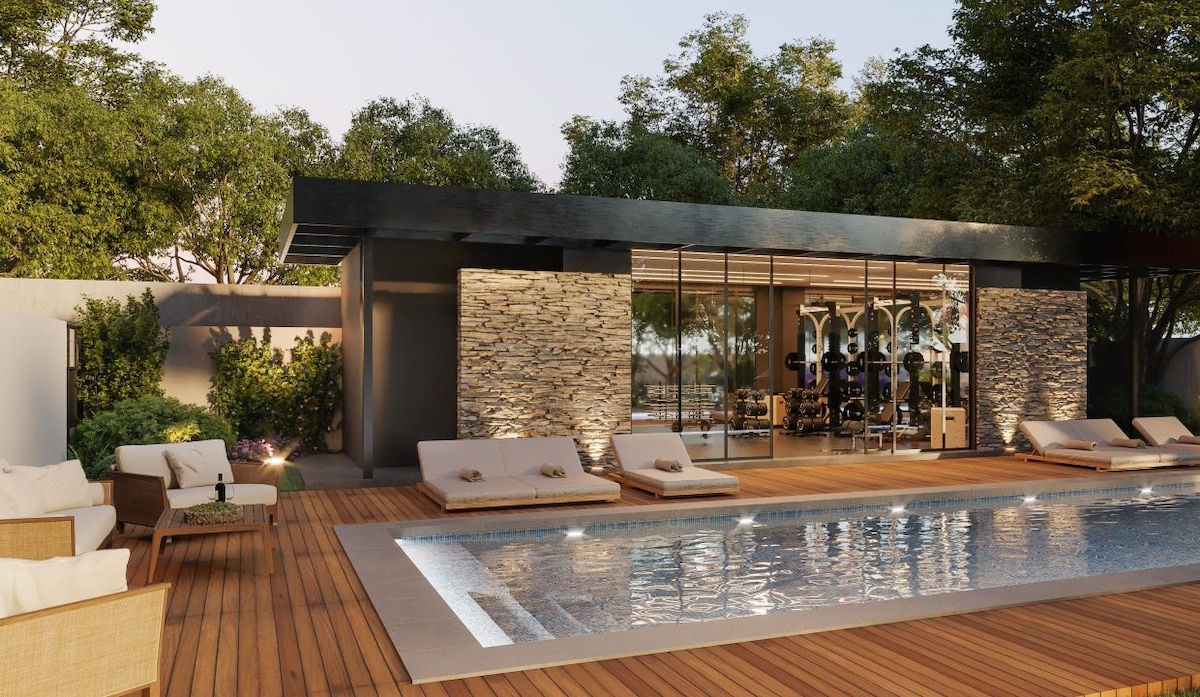 ಜಿಮ್, ಪ್ಯಾಡೆಲ್ ಕೋರ್ಟ್ ಮತ್ತು ಪೂಲ್ ಹೊಂದಿರುವ ಸ್ಟೈಲಿಶ್ ಸ್ಟುಡಿಯೋ