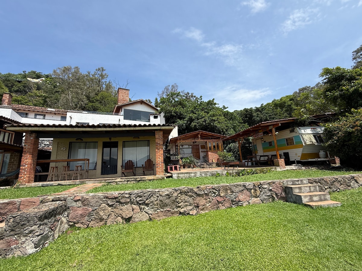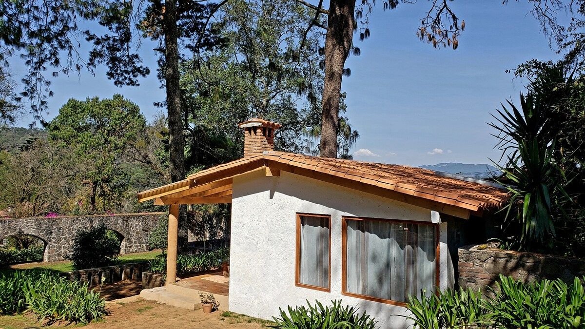 Disconnect from the routine in this unique and relaxing accommodation. A beautiful little villa, with a huge garden, private terrace, view of the lagoon and the flowers field, fireplace, patio with grill and wood oven. Located 10 minutes from Valle de Bravo in a beautiful area, full of nature and tranquility. Beautiful little place for you, for couples, friends or family and pet. The best option for you, book for a month, great for home office, per week or weekend.