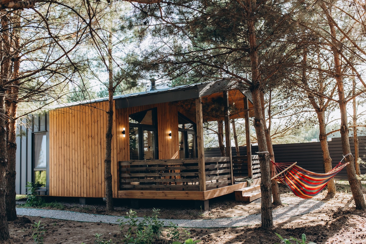У Затінку Сосен серед Аромату Хвої, нові будиночки для відпочинку під Києвом Будинки вписані серед дерев з максимальною обережністю, щоб Ви відчули гармонію з природою. На території 4 будиночки з просторою терасою, сосни, тиша, закрита територія, парковка, сауна. Біля одного з будиночків є чан. Це ідеальне місце для тих, хто хоче втекти від міської метушні, не від’їжджаючи далеко. Уявіть, замість шуму міських вулиць – шепіт дерев; замість задимленого повітря – чистий аромат хвої.