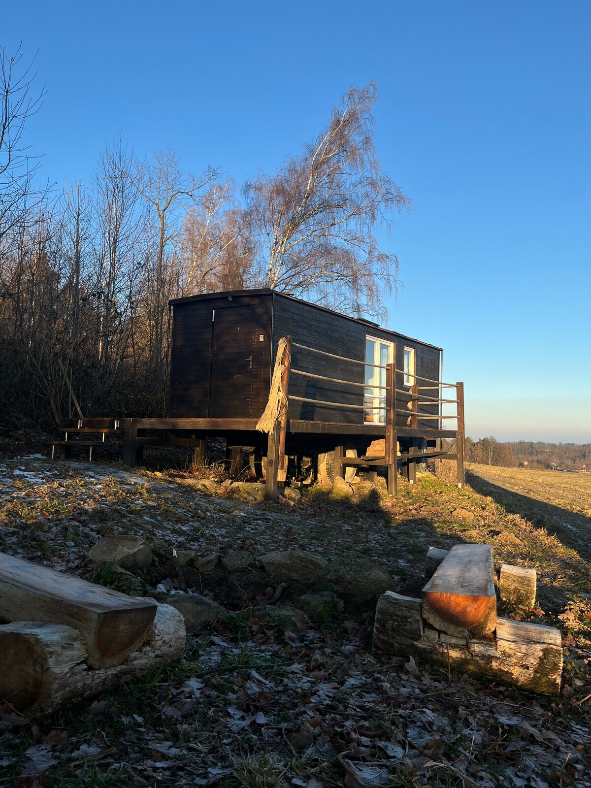 ನೀವು ಈ ವಾಸ್ತವ್ಯವನ್ನು ಇಷ್ಟಪಡುತ್ತೀರಿ! ಬಿಸಿಯಾದ ಸ್ನಾನದ ಬ್ಯಾರೆಲ್ ಅನ್ನು ಒಳಗೊಂಡಿರುವ ಪ್ರಕೃತಿಯ ಅಂಚಿನಲ್ಲಿರುವ ರಮಣೀಯ ಸಣ್ಣ ಮನೆ, ಅಲ್ಲಿ ನೀವು ಸಂಜೆ ಸಾವಿರಾರು ನಕ್ಷತ್ರಗಳು ಮತ್ತು ಮರೆಯಲಾಗದ ಪ್ರಣಯದಿಂದ ಮೋಡಿಮಾಡುತ್ತೀರಿ. ಸಂಪೂರ್ಣ ಸುಸಜ್ಜಿತ ಮನೆ ನಿಮಗೆ ಆರಾಮದಾಯಕ ವಾಸ್ತವ್ಯಕ್ಕಾಗಿ ಅಗತ್ಯವಿರುವ ಎಲ್ಲವನ್ನೂ ನೀಡುತ್ತದೆ- ಟಿವಿ ಮತ್ತು ನೆಟ್ಫ್ಲಿಕ್ಸ್ನೊಂದಿಗೆ ವಿಶಾಲವಾದ ಮಂಚದಿಂದ, ಸಂಜೆ ವಿಶಾಲವಾದ ವಿಶ್ರಾಂತಿಗೆ ಸೂಕ್ತವಾಗಿದೆ, ನೀವು ನಮ್ಮಿಂದ ಉಡುಗೊರೆಯಾಗಿ ಸ್ವೀಕರಿಸುವ ವೈನ್ ಬಾಟಲಿಯವರೆಗೆ. ನೀವು ಈ ಪ್ರದೇಶದಲ್ಲಿನ ಸುಂದರವಾದ ಸುತ್ತಮುತ್ತಲಿನ ಪ್ರಕೃತಿ ಮತ್ತು ದೃಶ್ಯಗಳನ್ನು ಆನಂದಿಸುತ್ತೀರಿ. ಬನ್ನಿ ಮತ್ತು ವಿಶ್ರಾಂತಿ ಪಡೆಯಿರಿ, ನೀವು ಮರೆಯಲಾಗದ ಶಾಂತಿ ಮತ್ತು ಪ್ರಣಯವನ್ನು ಅನುಭವಿಸಿ!