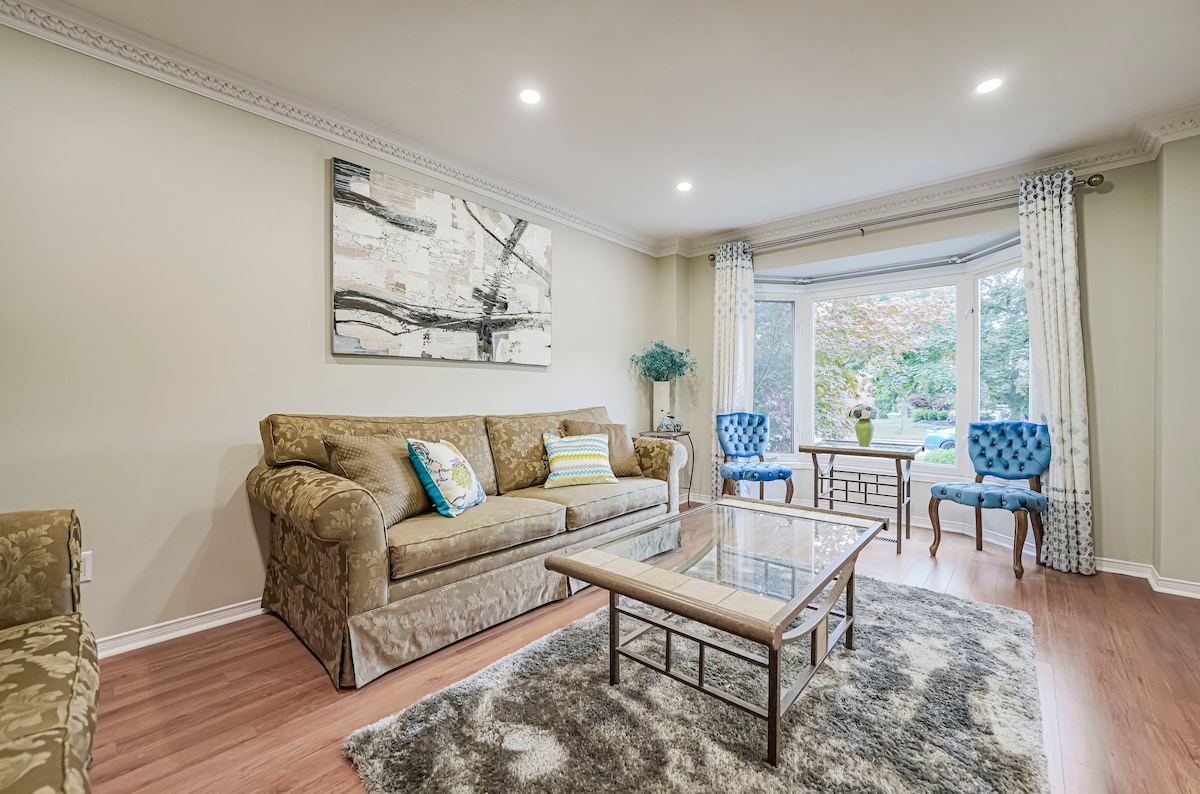 Experience cottage-style living in this renovated, furnished, and spacious (~1000 sqft) suite on the lower level of a 3-story home (walkout basement) on a ravine lot in a private cul-de-sac. -Separate entrance -Two bedrooms: Queen+double -Fully equipped kitchen, complimentary coffee/tea/snack -Free parking in the driveway -65-inch TV with Netflix -Private washer/dryer -Fresh linens, towels, toiletries -Few steps to the park/riverbank, a 10-min walk to Yonge through the backyard pathway