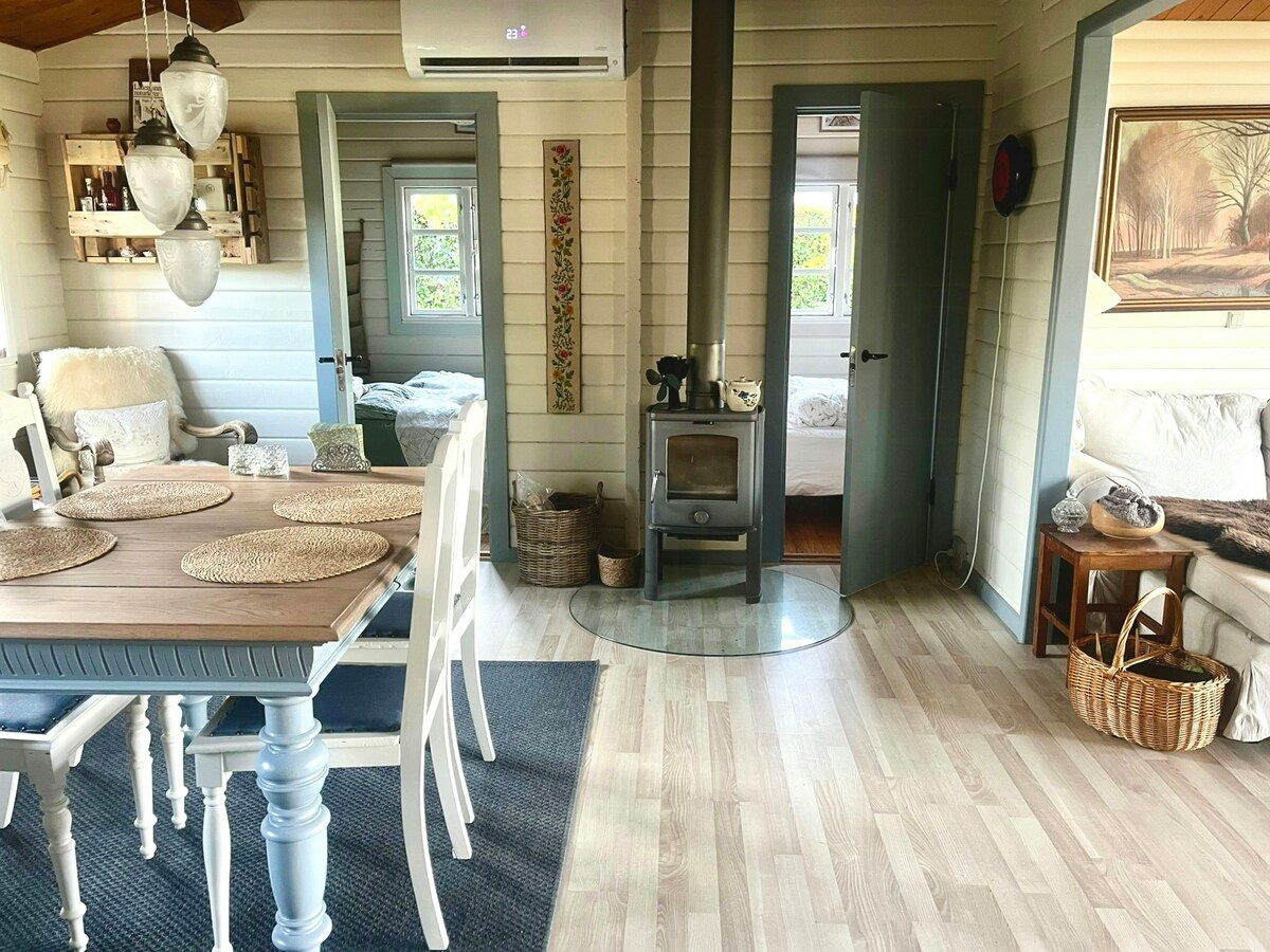 Bjælkehus! så et rigtig hytte/sommerhus, hvor det emmer af mormor hygge! Ingen tv , eller internet ,men masser af bøger og spil .(der er god 4 G forbindelse). Det er hyggeligt når brændeovnen er tændt, huset kan også opvarmes med varmepumpen, opvarmning kan startes inden ankomst. Med 200 meter ned til Fønsvig, hvor der er en badestrand., samt en lille badebro, hvor man lige kan snuppe en morgendukkert. Hvis man er til fiskeri, tager man ud og fanger havørred, samt andre fiskearter .