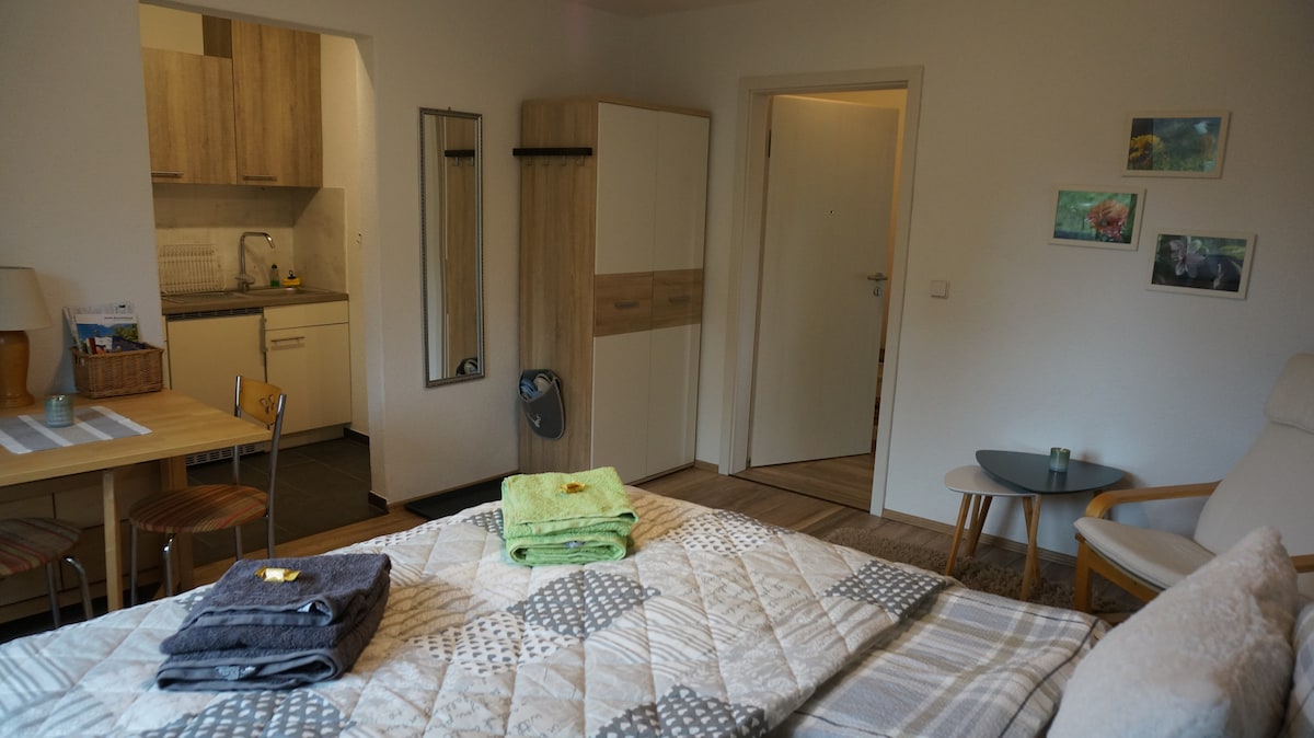 ಸುಸ್ವಾಗತ! ಎರಡು ಕುಟುಂಬದ ಮನೆಯ ಎತ್ತರದ ನೆಲ ಮಹಡಿಯಲ್ಲಿ ಆಧುನಿಕ ಸುಸಜ್ಜಿತ, ಸಣ್ಣ ಸ್ಟುಡಿಯೋ ನಿಮಗಾಗಿ ಕಾಯುತ್ತಿದೆ. ಅಡುಗೆಮನೆಯು ನಿಮಗೆ ಅಗತ್ಯವಿರುವ ಎಲ್ಲವನ್ನೂ ಹೊಂದಿದೆ: ಕ್ಯಾಪ್ಸುಲ್ ಕಾಫಿ ಯಂತ್ರ, ಕೆಟಲ್, ಮೈಕ್ರೊವೇವ್, ಸೆರಾಮಿಕ್ ಹಾಬ್, ಫ್ರಿಜ್. ನೋಟವು ನಮ್ಮ ಸುಂದರವಾದ ಉದ್ಯಾನಕ್ಕೆ ಹೋಗುತ್ತದೆ, ಬೈಸಿಕಲ್ಗಳನ್ನು ಅಲ್ಲಿ ನಿಲ್ಲಿಸಬಹುದು. ಕಾರನ್ನು ನೇರವಾಗಿ ಮನೆಯ ಮುಂದೆ ನಿಲ್ಲಿಸಬಹುದು. 10 ನಿಮಿಷಗಳಲ್ಲಿ ನೀವು ಸುಂದರವಾದ ನಗರ ಕೇಂದ್ರದಲ್ಲಿದ್ದೀರಿ ಅಥವಾ ಹತ್ತಿರದ ಸರೋವರದ ಬಳಿ 15 ನಿಮಿಷಗಳಲ್ಲಿರುತ್ತೀರಿ. ಕೇಂದ್ರ ಸ್ಥಳ ಇಲ್ಲ!