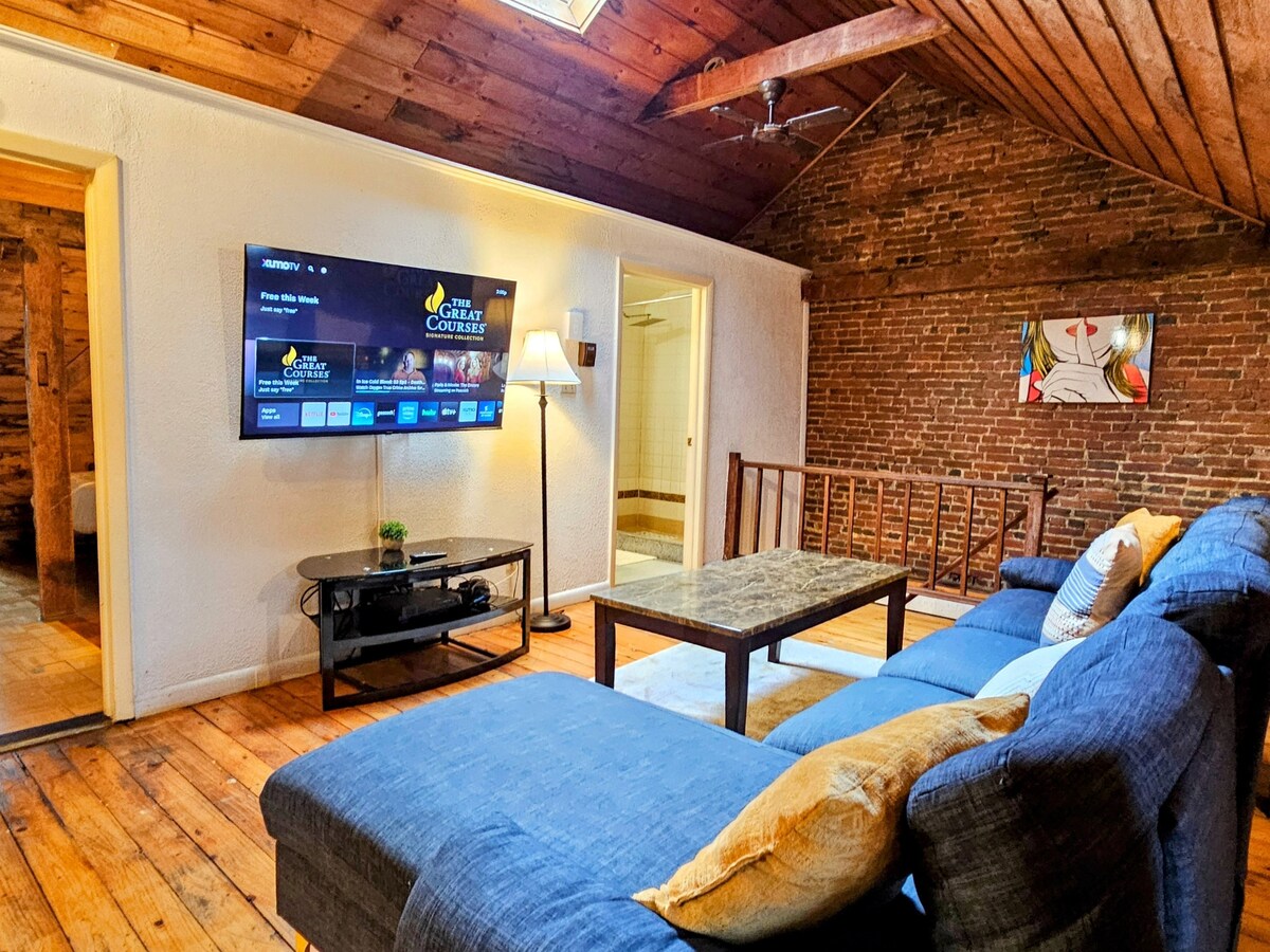 1800 ರ ಬಾರ್ನ್ ಗವರ್ನರ್ ಯೇಟ್ಸ್ ಮ್ಯಾನ್ಷನ್ಗೆ ಮೂಲ ಬಾರ್ನ್ ಆಗಿತ್ತು - ಇದು ಈಗ 2 ನೇ ಮಹಡಿಯ ಸ್ತಬ್ಧ, 400 ಚದರ ಅಡಿ "ತೆರೆದ ಪರಿಕಲ್ಪನೆ" ಸ್ಟುಡಿಯೋವನ್ನು ಹೊಂದಿದೆ. ಖಾಸಗಿ ಹೊರಾಂಗಣ ಡೆಕ್, ಆಫ್ಸ್ಟ್ರೀಟ್ ಪಾರ್ಕಿಂಗ್. ಗೋಡೆಗಳು ಮತ್ತು ಸೀಲಿಂಗ್ ಮೇಲೆ ಶಿಪ್ಲ್ಯಾಪ್ ಸೈಡಿಂಗ್ ಮತ್ತು ಹಳೆಯ ಮರದ ಮಹಡಿಗಳು ಸೇರಿದಂತೆ ಪಾತ್ರದ ಲೋಡ್ಗಳು. ಪೂರ್ಣ ಗಾತ್ರದ ಫ್ರಿಜ್, ಗ್ಯಾಸ್ ಸ್ಟೌವ್, ಮೈಕ್ರೊವೇವ್, ಟೋಸ್ಟರ್, ಕಾಫಿ ಮೇಕರ್, ಪಾತ್ರೆಗಳು, ಸಿಲ್ವರ್ವೇರ್, ಮಡಕೆ ಮತ್ತು ಪ್ಯಾನ್ಗಳನ್ನು ಹೊಂದಿರುವ ಸಂಪೂರ್ಣ ಸುಸಜ್ಜಿತ ಅಡುಗೆಮನೆ. ಸಣ್ಣ ಸ್ಟ್ಯಾಂಡ್ ಅಪ್ ಶವರ್ನೊಂದಿಗೆ ಪೂರ್ಣ ಸ್ನಾನ. ಕ್ವೀನ್ ಗಾತ್ರದ ಹಾಸಿಗೆ.
