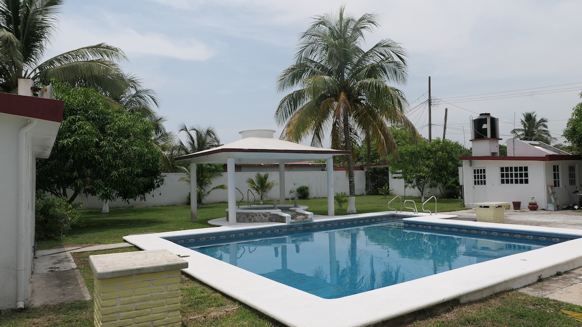 Casa con alberca, ubicada a 100 metros de la playa . Bien decorada, con 4 habitaciones ( y 2 adicionales) , baños y habitaciones amplias, camas cómodas, sala con tv, 2 comedores, cocina,alberca 4.5*8.5*1.40, parrilla, lugar para 2 autos, si son más autos pueden quedarse frente a la casa, es una cerrada y es muy seguro. Servicio de shampoo, jabón corporal y papel higiénico.