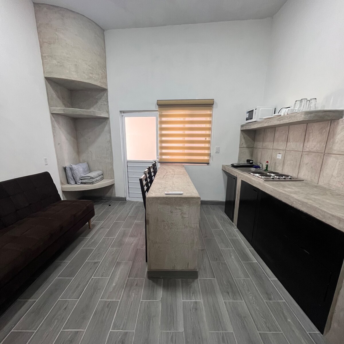 Te presentamos nuestro Departamento #3 Un espacio moderno y acogedor, ideal para una familia de cuatro (papá, mamá y dos niños). Este departamento destaca por sus techos altos, su diseño contemporáneo y la abundante luz natural que lo hace aún más especial. Cuenta con cocina completamente equipada, sofá cama, baño completo, clóset y todo lo necesario para que te sientas como en casa. Sin duda, ¡Un lugar que vas a disfrutar!