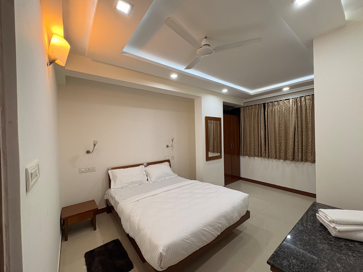 ಆರಾಮದಾಯಕ ಅನುಕೂಲತೆ ಮತ್ತು ಗೌಪ್ಯತೆಯನ್ನು ಬಯಸುವ ದಂಪತಿಗಳು ಮತ್ತು ಕುಟುಂಬಗಳಿಗೆ ಸೂಕ್ತವಾದ ನಮ್ಮ ಹೊಚ್ಚ ಹೊಸ, ವಿಶಾಲವಾದ ಸ್ಟುಡಿಯೋ ಫ್ಲಾಟ್ಗೆ ಸುಸ್ವಾಗತ. ಕಟ್ಟಡದಲ್ಲಿ ನಾವು ಒಟ್ಟು 7 ಒಂದೇ ಫ್ಲ್ಯಾಟ್ಗಳನ್ನು ಹೊಂದಿದ್ದೇವೆ. ಕಟ್ಟಡದಲ್ಲಿ ಲಿಫ್ಟ್ ಇಲ್ಲ. ಬೆಡ್ರೂಮ್ ಕಿಂಗ್ ಬೆಡ್, ಸ್ಮಾರ್ಟ್ ಟಿವಿ, ವೇಗದ ವೈಫೈ ಅನ್ನು ಹೊಂದಿದೆ ಮತ್ತು ಲಗತ್ತಿಸಲಾದ ಅಡುಗೆಮನೆ ಮತ್ತು ವಾಶ್ರೂಮ್ ಅನ್ನು ಅಗತ್ಯ ವಸ್ತುಗಳಿಂದ ಕೂಡಿದೆ. ಲಿವಿಂಗ್ ರೂಮ್ ಇಲ್ಲ. ಸಂಪೂರ್ಣ ಸುಸಜ್ಜಿತ ಅಡುಗೆಮನೆಯು ನಿಮ್ಮ ಪಾಕಶಾಲೆಯ ಸಾಹಸಗಳಿಗೆ ಮೂಲಭೂತ ಪದಾರ್ಥಗಳು, ಉತ್ತಮ-ಗುಣಮಟ್ಟದ ಉಪಕರಣಗಳು ಮತ್ತು ಕ್ರೋಕರಿಯನ್ನು ಒಳಗೊಂಡಿದೆ.