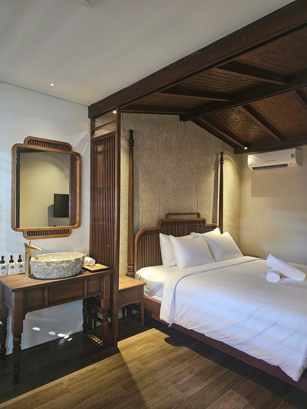 🎁 A newly built villa just 3 minutes’ walk to both Cua Dai Beach and Thu Bon River, offering a rare blend of privacy, wellness, and coastal charm. Enjoy a private pool, beach yoga, and walkable access to local restaurants and spas. With 3 serene bedrooms (2 king beds + 2 singles), it comfortably hosts 6 adults + 2 kids (under 6) — perfect for families seeking space, relaxation, and meaningful connection in a refined, tranquil setting.