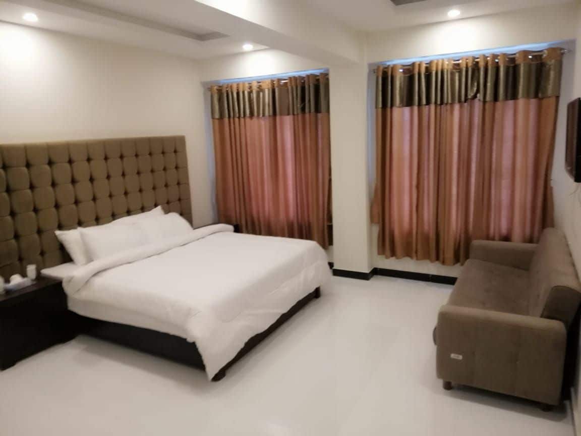 Premium Two Bed Room Apartment - Executive Standard Specifications: Bedrooms: Large King Size bed Twin singles Beds Living Area: 7-seater sofa, 55" Smart TV Central coffee table, separate entrance Kitchen/Dining: Fully equipped, 6 seat dining set Features: Wood-finish interiors, premium fittings High-speed prepaid internet, modern lighting Ideal for: Executive stays/family living (6 adults)