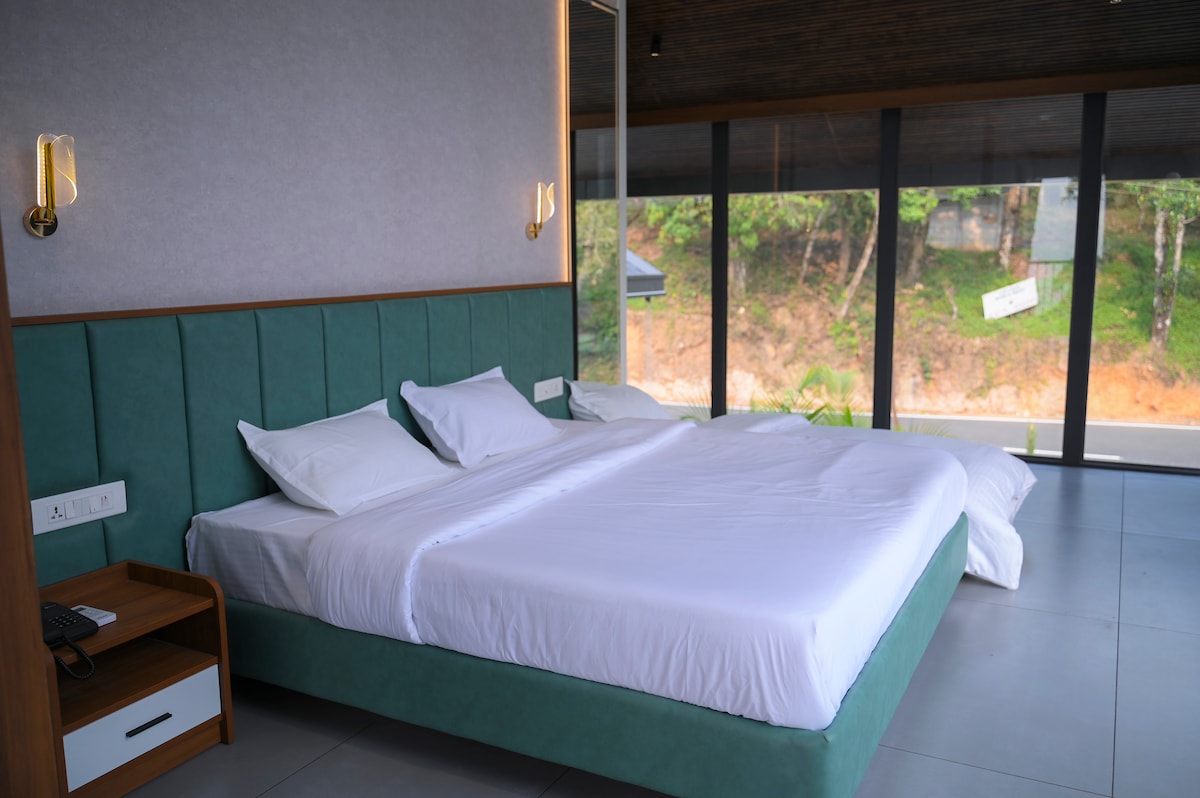 ನಿಮ್ಮ ಪ್ರೈವೇಟ್ ಬಾಲ್ಕನಿಯಿಂದ ಬೆರಗುಗೊಳಿಸುವ ಬೆಟ್ಟ ಮತ್ತು ಚೌಕಟ್ಟಿನ ವೀಕ್ಷಣೆಗಳೊಂದಿಗೆ ನಮ್ಮ ಪ್ರಶಾಂತ ಕೋಣೆಯಲ್ಲಿ ವಿಶ್ರಾಂತಿ ಪಡೆಯಿರಿ, ಅಲ್ಲಿ ನೀವು ಪ್ರಕೃತಿಯೊಂದಿಗೆ ಸಂಪರ್ಕ ಸಾಧಿಸಬಹುದು. ನಿಮ್ಮನ್ನು ಮನರಂಜನೆ ಮತ್ತು ಸಂಪರ್ಕದಲ್ಲಿಡಲು ರೂಮ್ ವೈ-ಫೈ ಮತ್ತು ಟಿವಿ ಸೇರಿದಂತೆ ಆಧುನಿಕ ಸೌಲಭ್ಯಗಳನ್ನು ಹೊಂದಿದೆ. ನಮ್ಮ ಮೀಸಲಾದ ಹೌಸ್ಕೀಪಿಂಗ್ ತಂಡವು ರೂಮ್ ಕಲೆರಹಿತ ಮತ್ತು ಆರಾಮದಾಯಕವಾಗಿದೆ ಎಂದು ಖಚಿತಪಡಿಸುತ್ತದೆ, ಪ್ರತಿಬಿಂಬ ಮತ್ತು ವಿಶ್ರಾಂತಿಗೆ ಆರಾಮದಾಯಕ ಸ್ಥಳವನ್ನು ಒದಗಿಸುತ್ತದೆ. ನಿಮ್ಮ ಆರಾಮದಾಯಕ ಬಾಲ್ಕನಿಯಿಂದ ತಾಜಾ ಗಾಳಿ ಮತ್ತು ರಮಣೀಯ ನೋಟಗಳನ್ನು ಆನಂದಿಸಿ.