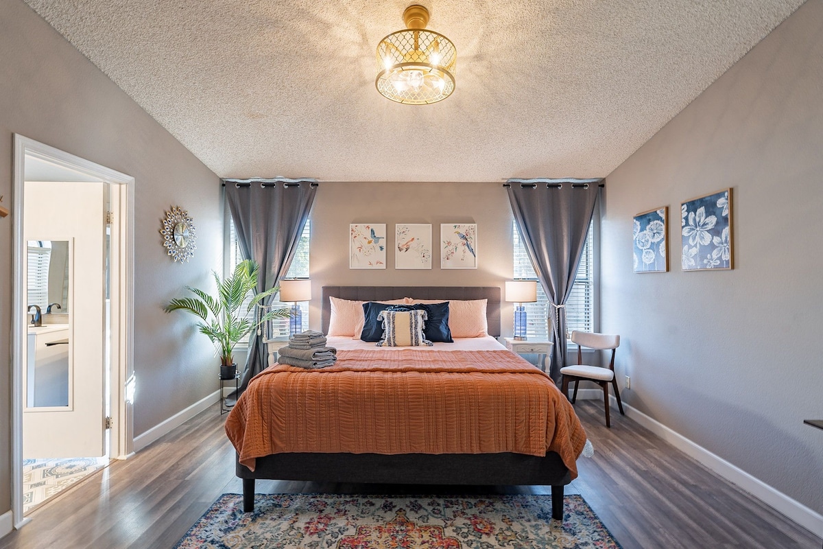 ಇಡೀ ಒಂದು ಕಥೆಯ ಮನೆಯನ್ನು ನಿಮಗೆ ನೀಡಲಾಗುತ್ತಿದೆ. ಇತ್ತೀಚೆಗೆ ನವೀಕರಿಸಿದ ಈ ಮನೆ 4 ಬೆಡ್ರೂಮ್ಗಳು ಮತ್ತು 2 ಬಾತ್ರೂಮ್ಗಳನ್ನು ಹೊಂದಿರುವ ಒಂದು ಅಂತಸ್ತಿನ ಮನೆಯಾಗಿದೆ. 3 ಕಾರುಗಳಿಗೆ ಸ್ಥಳಾವಕಾಶವಿರುವ ಪಾರ್ಕಿಂಗ್ಗೆ ಡ್ರೈವ್ವೇ ಲಭ್ಯವಿದೆ ಮತ್ತು ಬೀದಿಯಲ್ಲಿ ಹೆಚ್ಚಿನ ಸ್ಥಳವಿದೆ. ಹಾಟ್ ಟಬ್ ಮತ್ತು ಗ್ರಿಲ್ ಹೊಂದಿರುವ ದೊಡ್ಡ ಹಿತ್ತಲು ಮತ್ತು ಮುಖಮಂಟಪ ಸ್ವಿಂಗ್ ಹೊಂದಿರುವ ಗೆಜೆಬೊ. ನೀವು ಒಳಾಂಗಣದಲ್ಲಿ 6 ಕ್ಕೆ ಡೈನಿಂಗ್ ಟೇಬಲ್ ಅನ್ನು ಕಾಣುತ್ತೀರಿ! ರೆಸ್ಟೋರೆಂಟ್ಗಳು ಮತ್ತು ದಿನಸಿ ಮಳಿಗೆಗಳು ಕೆಲವೇ ನಿಮಿಷಗಳ ದೂರದಲ್ಲಿದೆ. 1 GB/s ಮತ್ತು ಪೂಲ್ ಟೇಬಲ್ ವರೆಗೆ ವೈಫೈ ಹೊಂದಿರುವ ಹೈ ಸ್ಪೀಡ್ ಇಂಟರ್ನೆಟ್