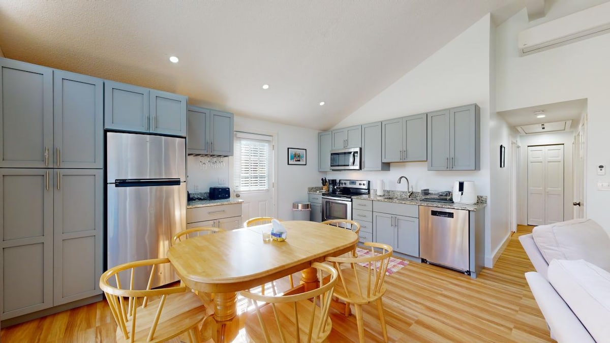 2 ಜನರಿಗೆ ಮಲಗುವ 700 ಚದರ ಅಡಿ ಪೋಸ್ಟ್ಮತ್ತು ಬೀಮ್ ಗೆಸ್ಟ್ ಹೌಸ್. ಪೂರ್ಣ ಸ್ನಾನದ ಕೋಣೆಯೊಂದಿಗೆ ತೆರೆದ ಅಡುಗೆಮನೆ, ಲಿವಿಂಗ್, ಡೈನಿಂಗ್ ಪ್ರದೇಶ. ಮೆಟ್ಟಿಲುಗಳು ಪೂರ್ಣ ಎರಡನೇ ಮಹಡಿಯ ಮಲಗುವ ಕೋಣೆಗೆ ಕಾರಣವಾಗುತ್ತವೆ- ರಾಣಿ ಗಾತ್ರದ ಹಾಸಿಗೆ, ಅರ್ಧ ಸ್ನಾನಗೃಹ, ಪ್ರತ್ಯೇಕ ಆಸನ ಪ್ರದೇಶ. ಖಾಸಗಿ ಹಿಂಭಾಗದ ಒಳಾಂಗಣ ಮತ್ತು ಹೊರಾಂಗಣ ಶವರ್. ಚೆನ್ನಾಗಿ ವಿಕಿರಣ ಶಾಖ ಮತ್ತು AC ಯಂತೆ ಆರಾಮದಾಯಕವಾದ ಸೀಸನ್ ಕಾಟೇಜ್. ನೀವು ನೋಡಲು ಬಯಸುವ ಎಲ್ಲದಕ್ಕೂ ಕೇಂದ್ರ ಸ್ಥಳ! ಪಟ್ಟಣ/ಕಡಲತೀರಕ್ಕೆ ಸುಲಭವಾದ ಬೈಕ್. ತುಂಬಾ ಶಾಂತ ಮತ್ತು ವಿಶಾಲವಾದ. ಪ್ರತಿಯೊಬ್ಬರೂ "ಫೋಟೋಗಳಲ್ಲಿರುವುದಕ್ಕಿಂತ ವೈಯಕ್ತಿಕವಾಗಿ ತುಂಬಾ ಒಳ್ಳೆಯದು" ಎಂದು ಹೇಳುತ್ತಾರೆ. ಬನ್ನಿ ನಿಮಗಾಗಿ ನೋಡಿ!