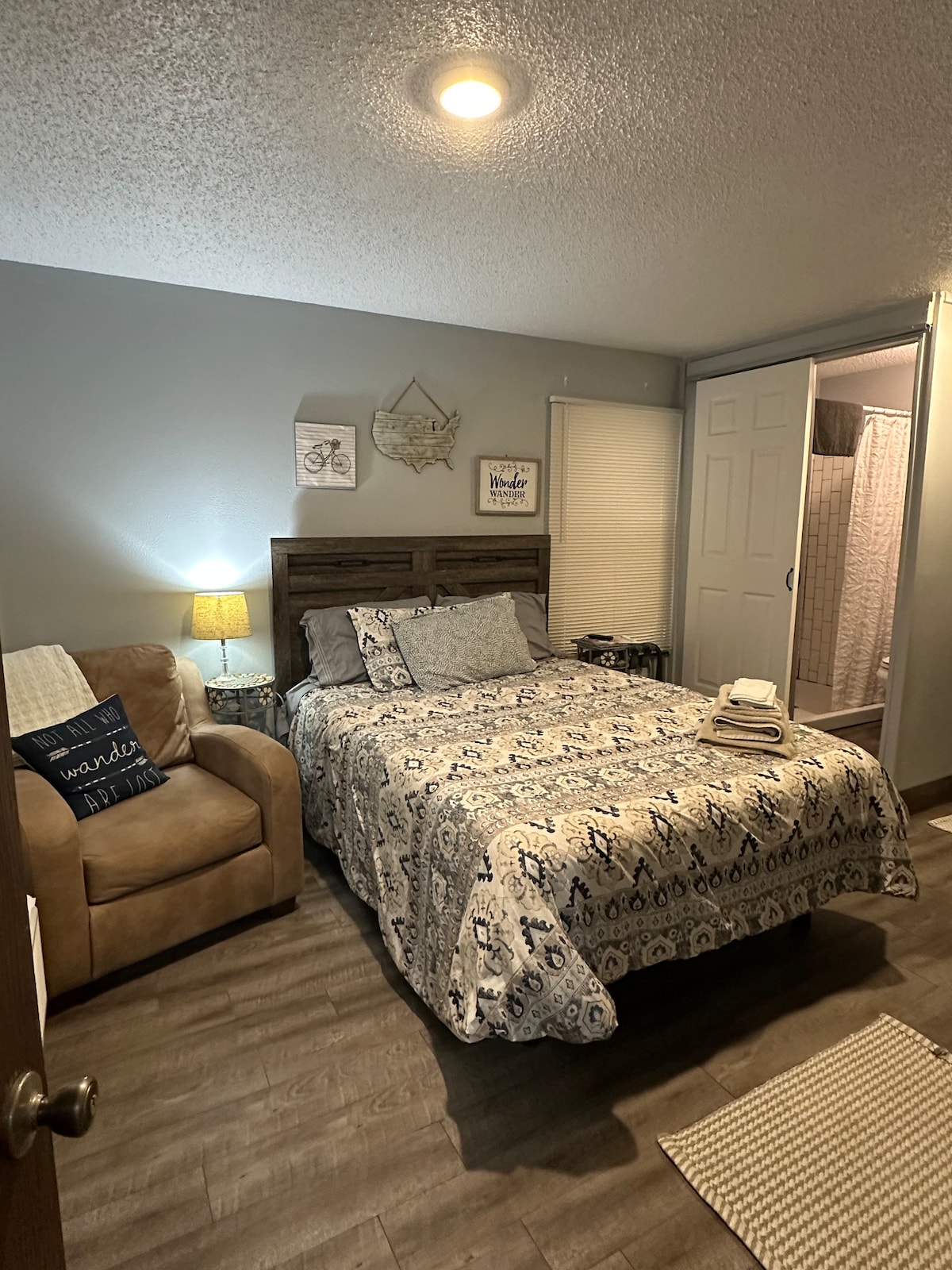 This cozy studio apartment is just right for a variety of patrons. Need a comfortable private space while visiting family? Working in the area for an extended period? Taking part in recreational activities nearby? This is the place for you. The Harvest Acres apartment has everything you'll need for a short or extended stay - full kitchen, washer/dryer, smart TV, WiFi, and a raw-space annex for bike storage/repairs, a game of darts, or room for 1 or 2 pets. *Check our pet policy before booking.