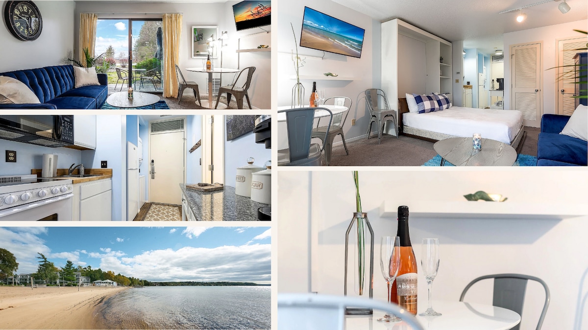 ಈಕ್ವೆಸ್ಟ್ರಿಯನ್ ಫೆಸ್ಟಿವಲ್ಗೆ 7 ನಿಮಿಷಗಳು! ಟ್ರಾವೆರ್ಸ್ ಸಿಟಿಯ ಸುಂದರವಾದ ಈಸ್ಟ್ ಬೇನಲ್ಲಿರುವ ಇದನ್ನು ಈಗಷ್ಟೇ ಸಂಪೂರ್ಣವಾಗಿ ನವೀಕರಿಸಲಾಗಿದೆ. ಕಾಂಡೋ ನೀರಿನಲ್ಲಿಯೇ ಇದೆ! ಡೌನ್ಟೌನ್ ಟ್ರಾವೆರ್ಸ್ ಸಿಟಿ, ವೈನ್ಕಾರ್ಖಾನೆಗಳು ಮತ್ತು ಇನ್ನೂ ಹೆಚ್ಚಿನವುಗಳಿಂದ ನಿಮಿಷಗಳು. 600 ಅಡಿ ಖಾಸಗಿ ಮರಳಿನ ಕಡಲತೀರದ ಮುಂಭಾಗದಲ್ಲಿ ಸೂರ್ಯನ ಬೆಳಕಿನಲ್ಲಿ ವಿಶ್ರಾಂತಿ ಪಡೆಯುವುದನ್ನು ಆನಂದಿಸಿ ಅಥವಾ ಕಯಾಕ್, ಜೆಟ್ ಸ್ಕೀಗಳು ಅಥವಾ ಪ್ಯಾಡಲ್ ಬೋರ್ಡ್ ಅನ್ನು ಬಾಡಿಗೆಗೆ ಪಡೆಯಿರಿ. ಈ ಸ್ಟುಡಿಯೋ ಶೈಲಿಯ ಕಾಂಡೋ ಕೊಲ್ಲಿಯ ಬಹುಕಾಂತೀಯ ನೋಟಗಳನ್ನು ಹೊಂದಿರುವ ಅಂತಿಮ ಘಟಕವಾಗಿದೆ. ಈ ಕಾಂಡೋ ಮಳೆ ತಲೆ ಮತ್ತು 3 ಬಾಡಿ ಸ್ಪ್ರೇಗಳೊಂದಿಗೆ ಅದ್ಭುತ ಶವರ್ ಅನ್ನು ಹೊಂದಿದೆ!