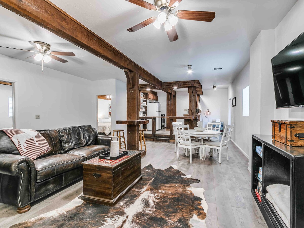 ನಿಮ್ಮ ಕಿಟಕಿಯ ಹೊರಗೆ ಮೇಯುತ್ತಿರುವ ಲಾಂಗ್ಹಾರ್ನ್ಗಳಿಗೆ ಎಚ್ಚರಗೊಳ್ಳಿ. ಈ ಬಂಕ್ಹೌಸ್ 75 ಎಕರೆ ಪ್ರದೇಶದಲ್ಲಿ ನೆಲೆಗೊಂಡಿದೆ, ಅದು ಇತರ ಗೆಸ್ಟ್ ತೋಟದ ಮನೆಯಿಂದ ವಾಕಿಂಗ್ ದೂರದಲ್ಲಿದೆ. ಇದು ರಿಕ್ ಅವರ ಮೊದಲ ಲೆದರ್ ಶಾಪ್ ಆಗಿತ್ತು! ವಾರಾಂತ್ಯದ ವಿಹಾರಕ್ಕೆ ಸೂಕ್ತವಾಗಿದೆ! ಡೌನ್ಟೌನ್ ಬಾರ್ಟಲ್ಸ್ವಿಲ್ನಿಂದ ಕೇವಲ 10 ನಿಮಿಷಗಳು ಮತ್ತು ಪಯೋನೀರ್ ವುಮನ್ ಮರ್ಕೆಂಟೈಲ್ನಿಂದ 40 ನಿಮಿಷಗಳು ಮಾತ್ರ ಇದೆ. ಸಮಯಕ್ಕೆ ಸರಿಯಾಗಿ ಹಿಂತಿರುಗಿ ಮತ್ತು ವೈಲ್ಡ್ ವೆಸ್ಟ್ ವಾತಾವರಣವನ್ನು ಆನಂದಿಸಿ. ಬಂಕ್ಹೌಸ್ ಅನ್ನು ಯೋಚಮ್ನ ಕಸ್ಟಮ್ ಲೆದರ್ ಮತ್ತು ಕೌಬಾಯ್ ಅಲಂಕಾರದಿಂದ ಐಷಾರಾಮಿ ಕೌಬಾಯ್ ವಿನ್ಯಾಸಗಳಿಂದ ಸಜ್ಜುಗೊಳಿಸಲಾಗಿದೆ.