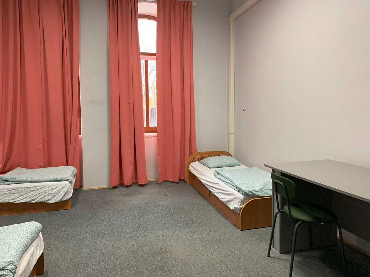 ಬಿಳಿ ಕೊಕ್ಕರೆ ಮತ್ತು ಚೆಸ್ಟ್ನಟ್ನ ಕೆಳಗೆ ಸಿನಗಾಗ್ನ ನೋಟದೊಂದಿಗೆ ಸ್ನಾನಗೃಹದೊಂದಿಗೆ ದೊಡ್ಡ, ಸೊಗಸಾದ ಕೊಠಡಿ. ಅಲಂಕಾರಿಕ ಸೀಲಿಂಗ್ ಈ ಸುಂದರ ಸ್ಥಳದ ವೈಭವದ ದಿನಗಳನ್ನು ನೆನಪಿಸುತ್ತದೆ. ಕೋಣೆಯಲ್ಲಿ 3 ಪ್ರತ್ಯೇಕ ಹಾಸಿಗೆಗಳು ಮತ್ತು ಸೋಫಾ ಬೆಡ್, ಬಟ್ಟೆಗಳಿಗಾಗಿ ವಾರ್ಡ್ರೋಬ್, ಟೇಬಲ್ ಮತ್ತು ಡ್ರೆಸ್ಸರ್ ಇವೆ. ಶವರ್ ಹೊಂದಿರುವ ಖಾಸಗಿ ಸ್ನಾನಗೃಹ. ಹಾಸ್ಟೆಲ್ನಲ್ಲಿ ಅತಿಥಿಗಳಿಗೆ ಕಿಚನೆಟ್ ಲಭ್ಯವಿದೆ. ನಾವು ಪ್ರಾಣಿಗಳನ್ನು ಸಹ ಸ್ವಾಗತಿಸುತ್ತೇವೆ, ಆದರೆ ಅವರು ಹಾಸಿಗೆಗಳ ಮೇಲೆ ಮಲಗಲು ಸಾಧ್ಯವಿಲ್ಲ. ಸಣ್ಣ ಮಕ್ಕಳಿಗೆ ಕೇಳಿದಾಗ ಬೇಬಿ ಕೋಟ್, ಸ್ನಾನದ ತೊಟ್ಟಿ ಮತ್ತು ಹೈ ಚೇರ್ ಲಭ್ಯತೆಯ ಮೇಲೆ ಅವಲಂಬಿತವಾಗಿರುತ್ತದೆ :)