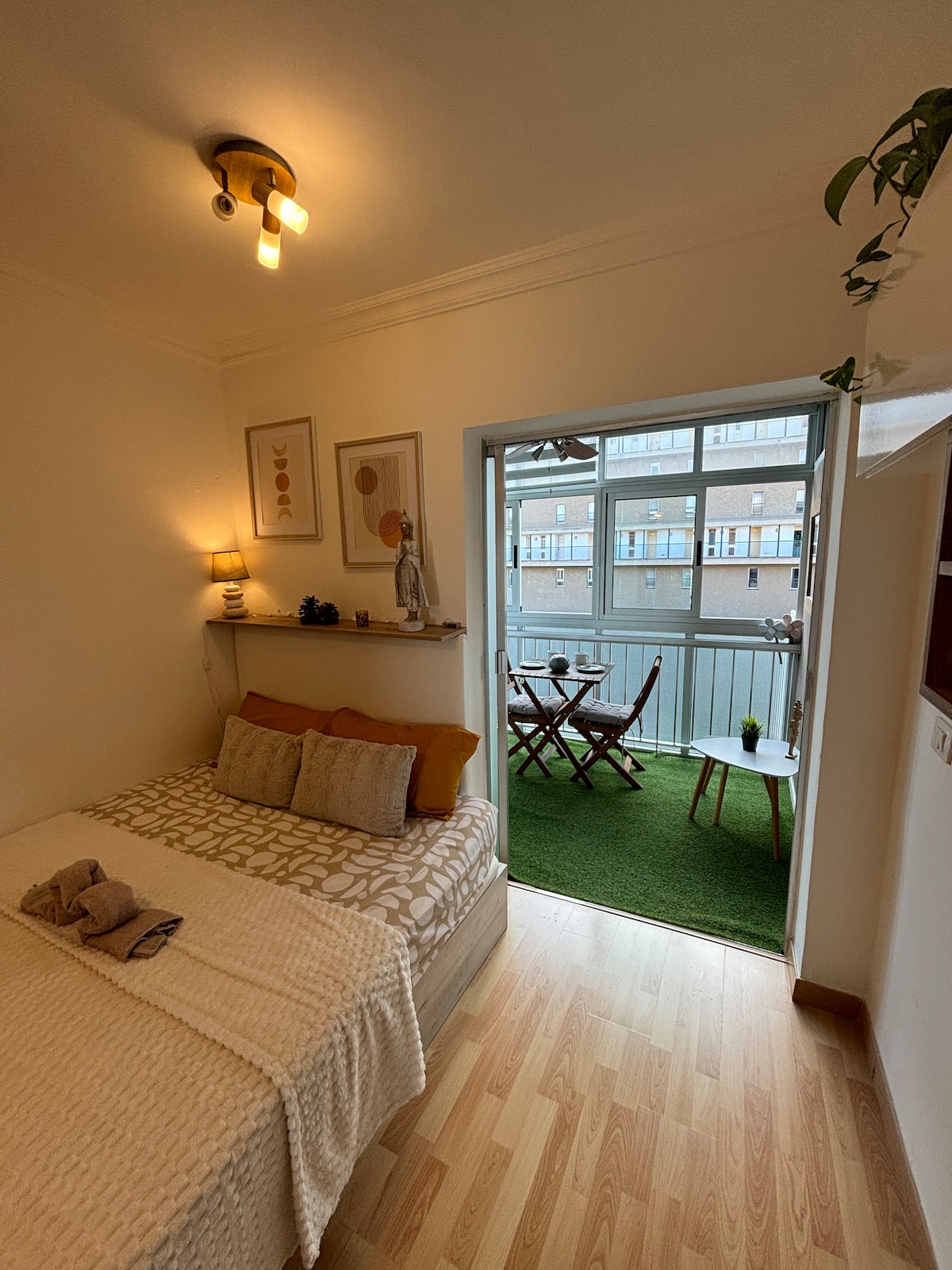 ನೀವು ಬಿಡಲು ಬಯಸದ ವಿಶೇಷ ಸ್ಥಳಕ್ಕೆ ಸುಸ್ವಾಗತ. ಈ ವಿಶಾಲವಾದ ಸ್ಟುಡಿಯೋ ಅಪಾರ್ಟ್ಮೆಂಟ್ ನಿಮ್ಮ ಸ್ವಂತ ಪ್ರೈವೇಟ್ ಟೆರೇಸ್ಗೆ ತೆರೆಯುತ್ತದೆ, ಅಲ್ಲಿ ನೀವು ಡಿನ್ನರ್, ಸನ್ಬಾತ್ ಮತ್ತು ರಿಫ್ರೆಶ್ ಹೊರಾಂಗಣ ಶವರ್ ಅನ್ನು ಆನಂದಿಸಬಹುದು. ಈ ಸ್ಟುಡಿಯೋವು ತೆರೆದ ಜೀವನ, ಊಟ ಮತ್ತು ಅಡುಗೆಮನೆ ಸ್ಥಳವನ್ನು ಹೊಂದಿದ್ದು, ಅಂತರ್ನಿರ್ಮಿತ ಹಾಸಿಗೆ ಮತ್ತು ಪ್ರತ್ಯೇಕ ಬಾತ್ರೂಮ್ಗಾಗಿ ವಿಶೇಷ ಮೂಲೆಯನ್ನು ಹೊಂದಿದೆ. ನೀವು ಕೆಲಸಕ್ಕಾಗಿ ಬಳಸಬಹುದಾದ ಅಥವಾ ವಿಶ್ರಾಂತಿ ಪಡೆಯಬಹುದಾದ ಪ್ರತ್ಯೇಕ ಸ್ನ್ಯಗ್ ಅನ್ನು ಸಹ ನೀವು ಟೆರೇಸ್ನಲ್ಲಿ ಕಾಣಬಹುದು. ಅಪಾರ್ಟ್ಮೆಂಟ್ ಪೋರ್ಟಬಲ್ ಸಿನೆಮಾ ಪ್ರೊಜೆಕ್ಟರ್ ಅನ್ನು ಸಹ ಒದಗಿಸುತ್ತದೆ.