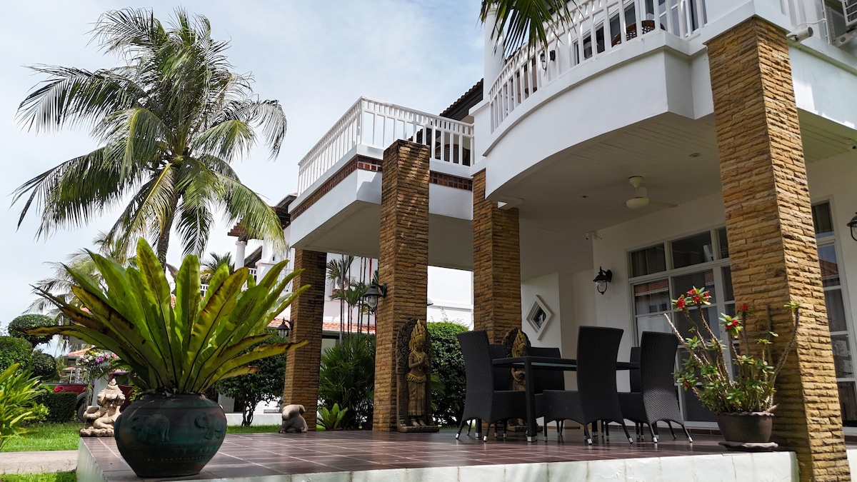 ಪೂರ್ವ ಥಾಯ್ ಕರಾವಳಿಯಲ್ಲಿರುವ ಸುಂದರವಾದ ಕಡಲತೀರದ ಮನೆ ಬೆರಗುಗೊಳಿಸುವ ಕೊಹ್ ಸ್ಯಾಮೆಟ್ ಮತ್ತು ಕೊಹ್ ಕಾಮ್ ದ್ವೀಪಗಳನ್ನು ಎದುರಿಸುತ್ತಿದೆ, ಬ್ಯಾಂಕಾಕ್ ಸುವರ್ಣಭೂಮಿ ವಿಮಾನ ನಿಲ್ದಾಣದಿಂದ ( ಬ್ಯಾಂಕಾಕ್) ಮತ್ತು ಉಟಪಾವೊ ವಿಮಾನ ನಿಲ್ದಾಣದಿಂದ ( ಪಟ್ಟಾಯಾ) 1 ಗಂಟೆ ಪ್ರಯಾಣ. ಸ್ನಾನಗೃಹಗಳು + ಒಂದು ರಾಣಿ ಸೋಫಾ ಹಾಸಿಗೆ ಮತ್ತು 1 ಬೇಬಿ ಮಂಚ ಮತ್ತು ಹವಾನಿಯಂತ್ರಣವನ್ನು ಹೊಂದಿರುವ 3 ಆರಾಮದಾಯಕ ಬೆಡ್ರೂಮ್ಗಳು. ಬಾಹ್ಯ BBQ ಹೊಂದಿರುವ ಸಂಪೂರ್ಣ ಸುಸಜ್ಜಿತ ಅಡುಗೆಮನೆ. ಜಕುಝಿ ಹೊಂದಿರುವ ದೊಡ್ಡ ಈಜುಕೊಳ ಮತ್ತು ಮಕ್ಕಳಿಗಾಗಿ ಪ್ರದೇಶ, ಟೆನಿಸ್ ಕೋರ್ಟ್, ಸೆಕ್ಯುರಿಟಿ ಗಾರ್ಡ್ 24/7 ಮತ್ತು ಹೆಚ್ಚಿನವು.