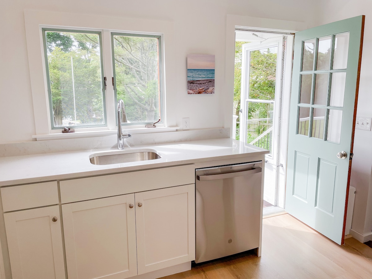 Come to Rockport this spring and stay at this renovated waterfront apartment in a historic home with onsite parking, yard and a private entrance. Our prime downtown location is steps from beaches, restaurants, coffee shops, live music, and shopping on Bearskin Neck. Features full kitchen and bathroom with new applicances and fixtures. Living room has a loveseat, swivel chair, dining table, coffee table, roku TV, games, puzzles & books. Kitchen has a fridge, stove, oven, microwave and Keurig.