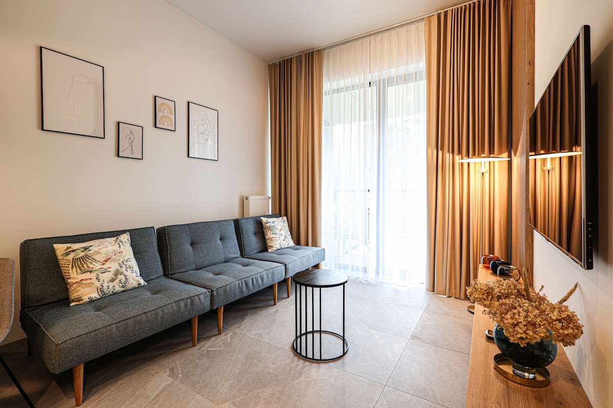 ಕೊಲೊಬ್ರಜೆಗ್ನ ಹೃದಯಭಾಗದಲ್ಲಿರುವ ಸ್ಟೈಲಿಶ್ ಅಪಾರ್ಟ್ಮೆಂಟ್ ಅನ್ನು 6 ಜನರಿಗೆ ವಿನ್ಯಾಸಗೊಳಿಸಲಾಗಿದೆ. ಲಿವಿಂಗ್ ರೂಮ್ಗೆ ಸುಮಾರು 95 ಮೀ 2 ತೆರೆದಿರುವ ಊಟದ ಪ್ರದೇಶವನ್ನು ಹೊಂದಿರುವ ಅಡುಗೆಮನೆ ಇದೆ. ಸ್ಮಾರ್ಟ್ ಫಂಕ್ಷನ್ ಮತ್ತು ಸೋಫಾ ಹಾಸಿಗೆಯೊಂದಿಗೆ 75 ಇಂಚಿನ ಟಿವಿ ಹೊಂದಿರುವ ಆಸನ ಪ್ರದೇಶ. ಎರಡು ಲಾಕ್ ಮಾಡಬಹುದಾದ ಬೆಡ್ರೂಮ್ಗಳು ಉತ್ತಮ ಆರಾಮವನ್ನು ಒದಗಿಸುತ್ತವೆ. ಮಾಸ್ಟರ್ ಬೆಡ್ರೂಮ್ 160x200cm ಡಬಲ್ ಬೆಡ್ ಮತ್ತು ಕನ್ನಡಿಯೊಂದಿಗೆ ಡ್ರೆಸ್ಸಿಂಗ್ ಟೇಬಲ್ ಅನ್ನು ಹೊಂದಿದೆ. ಎರಡನೇ ಬೆಡ್ರೂಮ್ನಲ್ಲಿ, ಎರಡು ಸಿಂಗಲ್ ಬೆಡ್ಗಳು 90x200cm ಇವೆ. ಎರಡೂ ಬೆಡ್ರೂಮ್ಗಳು ಬಾಲ್ಕನಿಗೆ ಪ್ರವೇಶವನ್ನು ಹೊಂದಿವೆ.