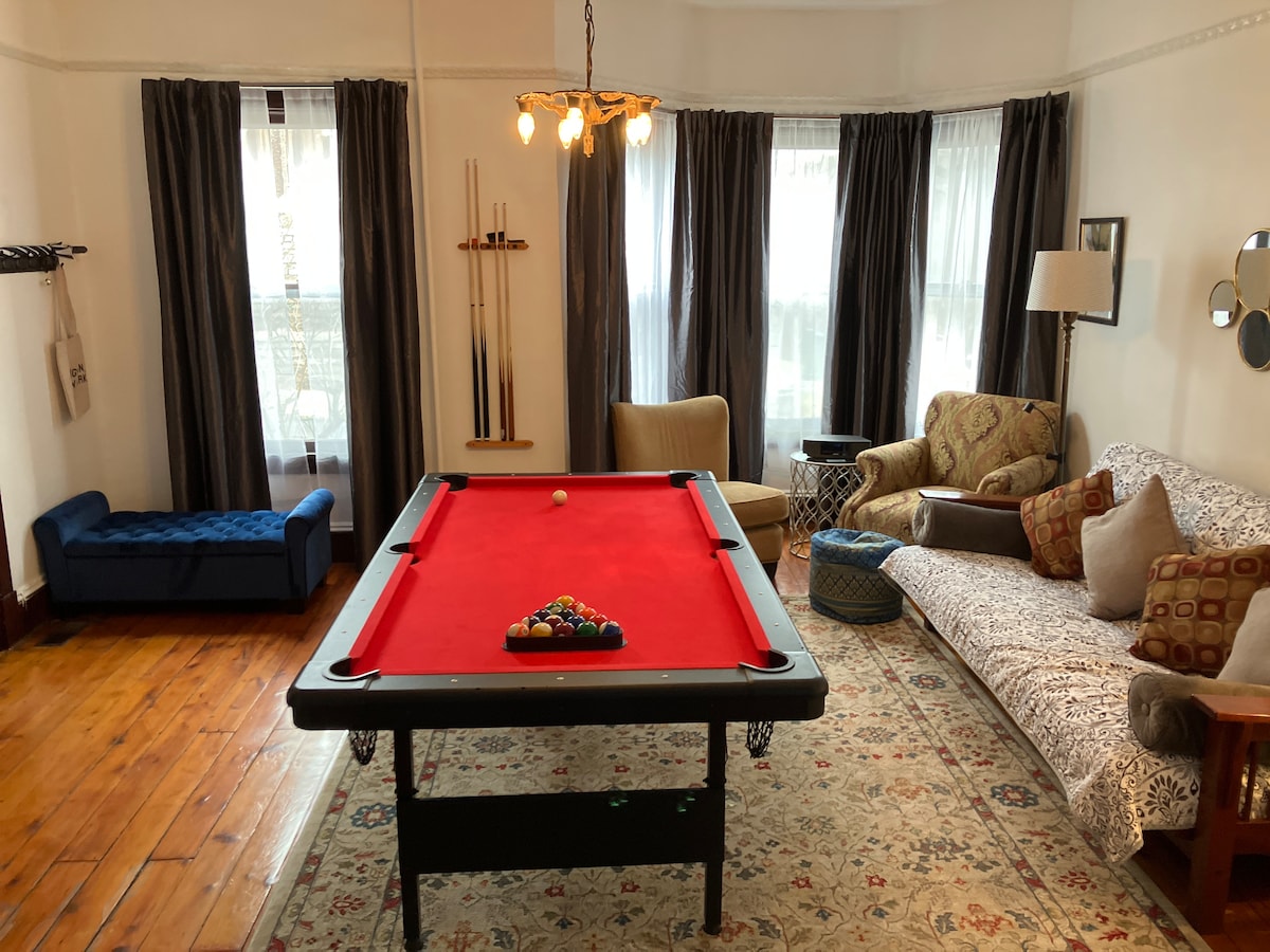 ಕಿಂಗ್ಸ್ಟನ್ ಹಿಸ್ಟಾರಿಕ್ ರಾಂಡೌಟ್ ಜಿಲ್ಲೆಯಲ್ಲಿರುವ 10 ಅಡಿ ಛಾವಣಿಗಳನ್ನು ಹೊಂದಿರುವ ದೊಡ್ಡ 1 ಮಲಗುವ ಕೋಣೆ ಅಪಾರ್ಟ್ಮೆಂಟ್. ರಾಣಿ ಗಾತ್ರದ ಹಾಸಿಗೆ ಮತ್ತು ಒಂದು ದೊಡ್ಡ ಫ್ಯೂಟನ್ ಸಂಭಾಷಣೆ, ಲಿವಿಂಗ್ ರೂಮ್, ಪೂಲ್ ಟೇಬಲ್, ಸಾಕಷ್ಟು ನೈಸರ್ಗಿಕ ಬೆಳಕು, ಬ್ಲ್ಯಾಕ್ಔಟ್ ಪರದೆಗಳು, ಹವಾನಿಯಂತ್ರಣ, ಪಂಜದ ಕಾಲು ಟಬ್, ಸಣ್ಣ ಖಾಸಗಿ ಒಳಾಂಗಣ, 60 ಇಂಚಿನ ಗೋಡೆಯ ಟಿವಿ, ಐತಿಹಾಸಿಕ ರಾಂಡೌಟ್ ವಾಟರ್ ಫ್ರಂಟ್, ರೆಸ್ಟೋರೆಂಟ್ಗಳು, ದೋಣಿ ಸವಾರಿಗಳು, ಟ್ರಾಲಿ, ಆರ್ಟ್ ಗ್ಯಾಲರಿಗಳು, ಕಿಂಗ್ಸ್ಟನ್ ಪಾಯಿಂಟ್ ಬೀಚ್ ಮತ್ತು ಹಡ್ಸನ್ ಬ್ರಿಕ್ಯಾರ್ಡ್ಗಳಿಂದ ಬೆಡ್ರೂಮ್ ಅನ್ನು ಪ್ರತ್ಯೇಕಿಸುವ ದೊಡ್ಡ ಪಾಕೆಟ್ ಬಾಗಿಲುಗಳಿವೆ.