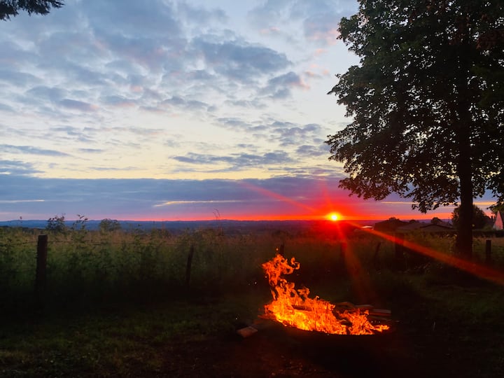 - ಸುಂದರವಾದ ಸುಣ್ಣದ ಮರ ಮತ್ತು ಅರಣ್ಯ ಮತ್ತು ಬ್ರಿಯೊನ್ನೈಸ್ನ ವೀಕ್ಷಣೆಗಳಿಂದ ಸೂರ್ಯನಿಂದ (ಅಥವಾ ರಾತ್ರಿಯ ತಂಪಿನಿಂದ) ರಕ್ಷಿಸಲಾದ ಊಟ/ಭೋಜನಕ್ಕೆ ಟೇಬಲ್. ಅದ್ಭುತ ಸೂರ್ಯಾಸ್ತ!