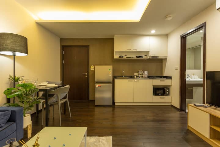 ಬಾಲ್ಕನಿ, ಪೂರ್ಣ ಅಡುಗೆಮನೆ ಮತ್ತು ಆರಾಮದಾಯಕ ಲೌಂಜ್ ಹೊಂದಿರುವ 🔓 ಸ್ಟೈಲಿಶ್ 1BR ಘಟಕ