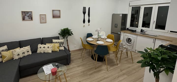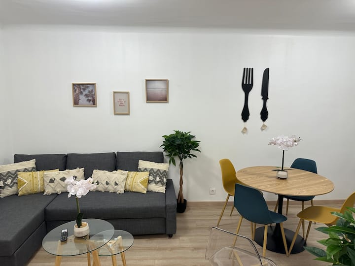 - 1 ತುಂಬಾ ಆರಾಮದಾಯಕವಾದ ಸೋಫಾ ಹಾಸಿಗೆ (ಮಲಗುವ 140 x 200cm) ಮತ್ತು ಸ್ಮಾರ್ಟ್ ಟಿವಿ ಹೊಂದಿರುವ ಪ್ರಕಾಶಮಾನವಾದ ಲಿವಿಂಗ್ ರೂಮ್, ಅಲ್ಲಿ ನೀವು ದೊಡ್ಡ ಗೋಡೆಯ ಪರದೆಯಲ್ಲಿ ನಿಮ್ಮ ಎಲ್ಲಾ ನೆಚ್ಚಿನ ಚಲನಚಿತ್ರಗಳು ಮತ್ತು ಸರಣಿಯನ್ನು ವೀಕ್ಷಿಸಬಹುದು (ಫೈಬರ್ ಆಪ್ಟಿಕ್ 300Mb/s. ನೆಟ್ಫ್ಲಿಕ್ಸ್, ಅಮೆಜಾನ್ ಪ್ರೈಮ್, ಯೂಟ್ಯೂಬ್ ಇತ್ಯಾದಿಗಳೊಂದಿಗೆ 50 ಇಂಚಿನ ಸ್ಕ್ರೀನ್). 1/4 ಗೆಸ್ಟ್ಗಳು ಕುಳಿತುಕೊಳ್ಳುವ ಡೈನಿಂಗ್ ಟೇಬಲ್ನೊಂದಿಗೆ. (ಅಥವಾ ಮಗುವಿನೊಂದಿಗೆ 5)