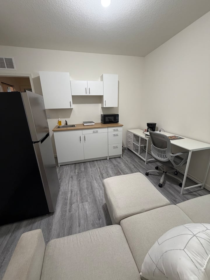 ಕೀಪ್ಯಾಡ್ ಹೊಂದಿರುವ ಮನೆಯ ಮುಖ್ಯ ಪ್ರವೇಶದ್ವಾರದ ಮೂಲಕ ನೀವು ಪ್ರವೇಶಿಸುತ್ತೀರಿ. ಒಳಗೆ ಪ್ರವೇಶಿಸಿದ ನಂತರ, ಹಜಾರದಲ್ಲಿ ಎಡಭಾಗದಲ್ಲಿರುವ ಮೊದಲ ಬಾಗಿಲು ನಿಮ್ಮ ಖಾಸಗಿ ಗೆಸ್ಟ್ ಸೂಟ್ ಆಗಿದೆ. ಈ ದಕ್ಷತೆಯು ಸಂಪೂರ್ಣವಾಗಿ ಸ್ವತಂತ್ರವಾಗಿದೆ ಮತ್ತು ತನ್ನದೇ ಆದ ಪ್ರೈವೇಟ್ ಬಾತ್ರೂಮ್, ಅಡಿಗೆಮನೆ ಮತ್ತು ಮಲಗುವ ಕೋಣೆಯನ್ನು ಹೊಂದಿದೆ.