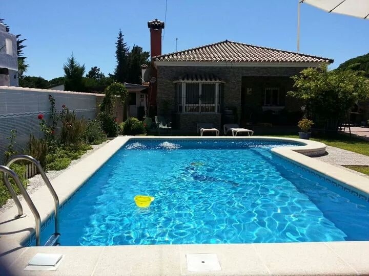 Chalet, playa de la Barrosa a 9km. En zona muy tranquila: Piscina con iluminacion led 7x3,5 ducha de exterior. Jacuzzi agua fria/caliente, cromoterapia y limpieza por Ozono. Chimenea interior (leña y carbón no incluidos) Zona barbacoa, comedor exterior con techo de caña. Azotea solarium. En su interior encontrarás un ambiente acogedor y comodo, 3 dormitorios 2 camas de 1,5cm y 2 de 90cm. Cocina totalmente equipada. Salón 38m2, Smart TV 55" Wifi. A 1,3km centro, Super, restaurantes a 200m.