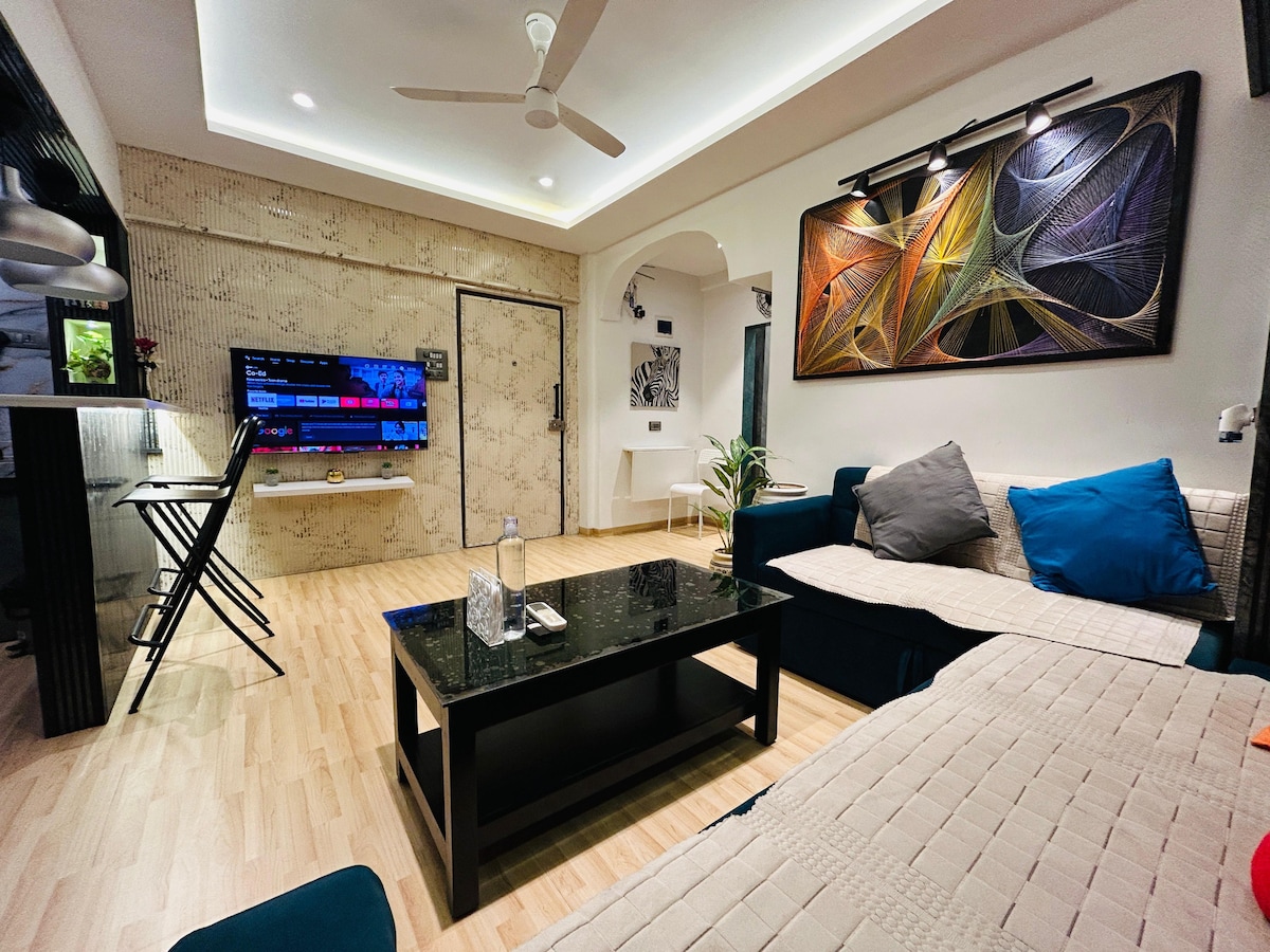 Welcome to Your Modern Day-Chic 1-Bedroom Apartment Retreat near BKC! With its minimalist design, ample workspace, entertainment options, and essential amenities, it caters to the needs of both business and leisure travelers! Features: ★ Large Work-Desk ★ Free High-Speed WiFi ★ Smart TV ★ Tata Sky with all HD Channels ★ Sound Bar ★ Microwave/Fridge ★ Air Fryer ★ Air Purifier ★ Water Purifier Book now and experience the perfect blend of modernity and comfort!