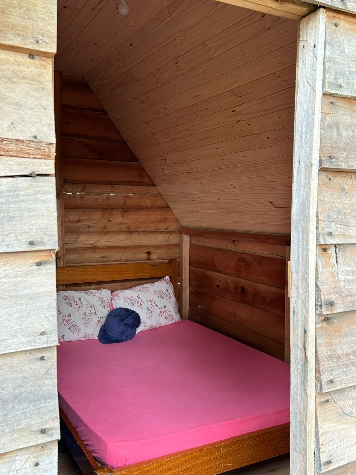 Chalé com acomodações individuais, sendo 1 quarto com 1 cama de casal e 1 de solteiro e colchões avulsos, mais outro quarto com cama de solteiro, banheiro amplo. Na entrada já se depara com espelho de corpo inteiro para avaliar seu perfil. Sala e cozinha com sofás, mesa, geladeira, microondas, fogão a gás e a lenha para dias frios ou a qualquer momento. Armário com utensílios domésticos. Endereço exato do chalé: PR-090 - Boa Vista, Campo Largo - PR, 83648-000