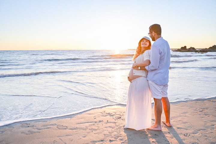 ಸುವರ್ಣ ಸಮಯದಲ್ಲಿ ಕಡಲತೀರದಲ್ಲಿ ನಿಮ್ಮ, ನಿಮ್ಮ ಭವಿಷ್ಯದ ಮಗು ಮತ್ತು ಪತಿ ಅಥವಾ ಸಂಗಾತಿಯ ಸುಂದರವಾದ ಕನಸಿನ ಫೋಟೋಗಳು.
