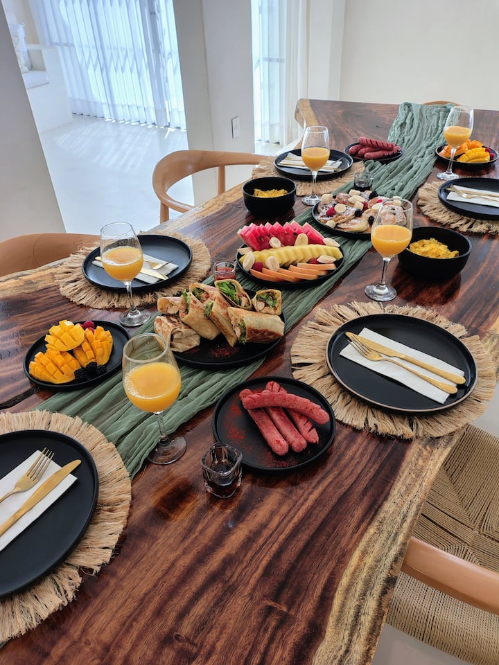 ತಾಜಾ ಹಣ್ಣುಗಳು, ಹಾಟ್ಕೇಕ್ಗಳು, ಆವಕಾಡೊ ಟೋಸ್ಟ್, ಬೇಯಿಸಿದ ಮೊಟ್ಟೆಗಳು, ಮೊಸರು, ಗ್ರಾನೋಲಾ, ಕಾಫಿ ಮತ್ತು ರಸ