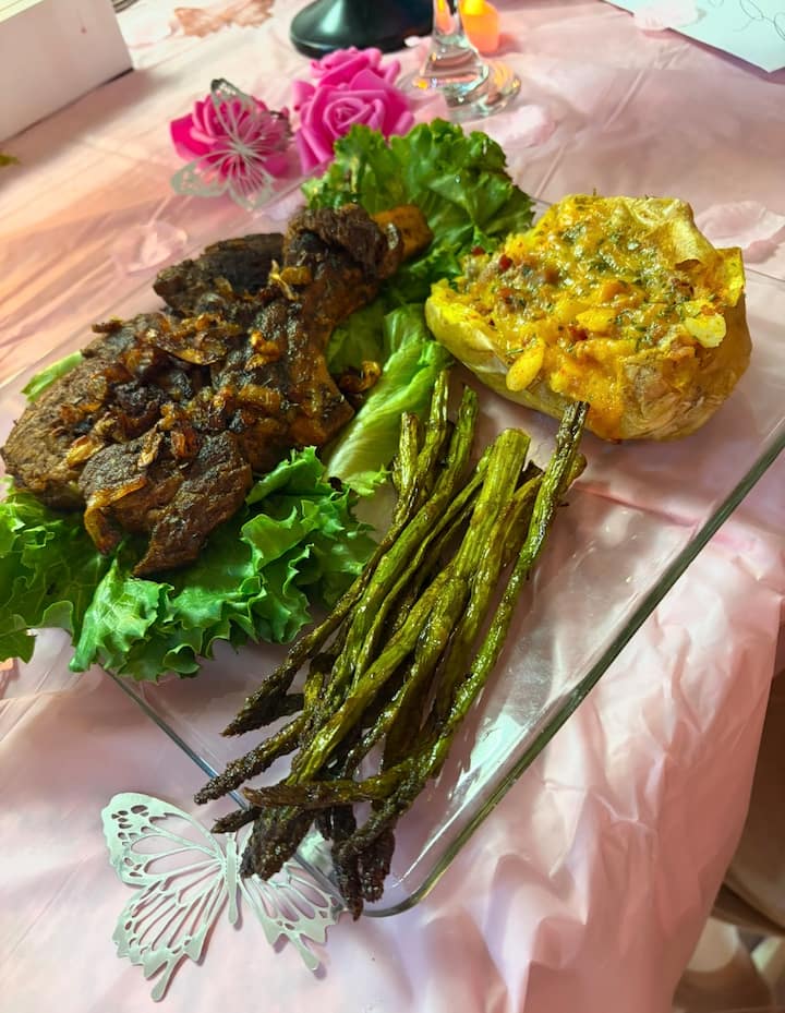 32-ಔನ್ಸ್ ಮೂಳೆ-ಇನ್ ರಿಬೇ, ಪರಿಣಿತ ಒಣಗಿದ ಮತ್ತು ಪರಿಪೂರ್ಣತೆಗೆ ಬೇಯಿಸಿದ, ಬೇಯಿಸಿದ/ಹುರಿದ ಬೆಳ್ಳುಳ್ಳಿ ಬೆಣ್ಣೆ ಪಾರ್ಮೆಸನ್ ಆಲೂಗಡ್ಡೆಯೊಂದಿಗೆ ಬಡಿಸಲಾಗುತ್ತದೆ. ಬ್ರೊಕೊಲಿ ಮತ್ತು ಚೀಸ್/ಶತಾವರಿ.