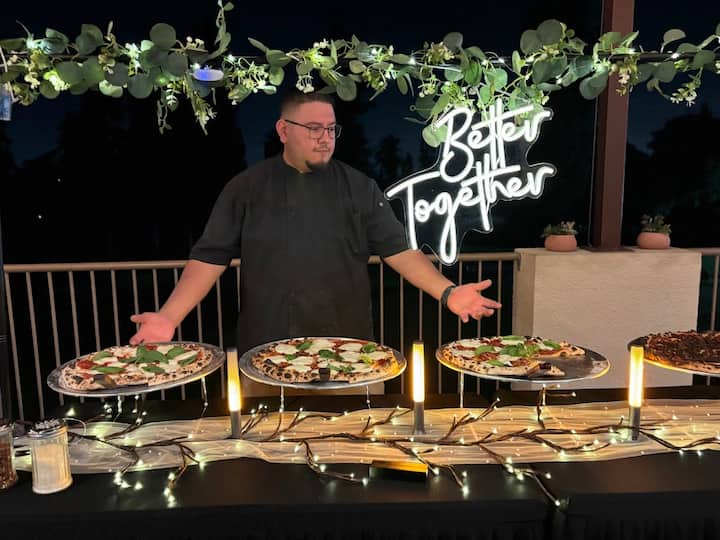 ಇದು ಆಯ್ಕೆಯ ಸ್ಥಳದಲ್ಲಿ ಬಾಣಸಿಗ-ಚಾಲಿತ ಊಟವಾಗಿದೆ. ಇದು ತಾಜಾ ಆಂಟಿಪಾಸ್ಟೊ ಸಲಾಡ್, ಬೆಚ್ಚಗಿನ ಬ್ರೆಡ್ಸ್ಟಿಕ್ಗಳನ್ನು ಹೊಂದಿದೆ, ನಂತರ ಕೈಯಿಂದ ಚಾಚಿದ ಪಿಜ್ಜಾಗಳನ್ನು ಆನ್-ಸೈಟ್ನಲ್ಲಿ ಧರಿಸಲಾಗುತ್ತದೆ ಮತ್ತು ಗುಂಡು ಹಾರಿಸಲಾಗುತ್ತದೆ ಮತ್ತು ಸಿಗ್ನೇಚರ್ ಡೆಸರ್ಟ್ ಪಿಜ್ಜಾ ಹೊಂದಿರುವ ಕಾಲೋಚಿತ ಹಣ್ಣಿನ ತಟ್ಟೆಯೊಂದಿಗೆ ಪೂರ್ಣಗೊಳ್ಳುತ್ತದೆ.