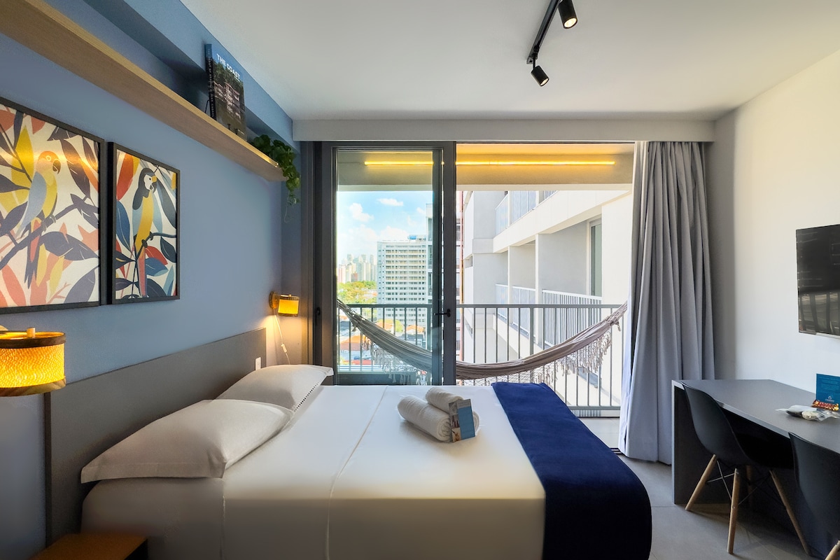 New studio, very well decorated and equipped, with all the necessary amenities for your stay. Fully automated, comfortable, cozy. The building is modern with an excellent leisure infrastructure: swimming pool, gym, ballroom with bar, coworking, laundry and bike rack. It has a green view of the square, the street is quiet and easily accessible. It is located between the neighborhoods of Moema, Brooklin and Vila Olimpia, 5 minutes from Shopping Ibirapuera and 15 from Congonhas Airport.