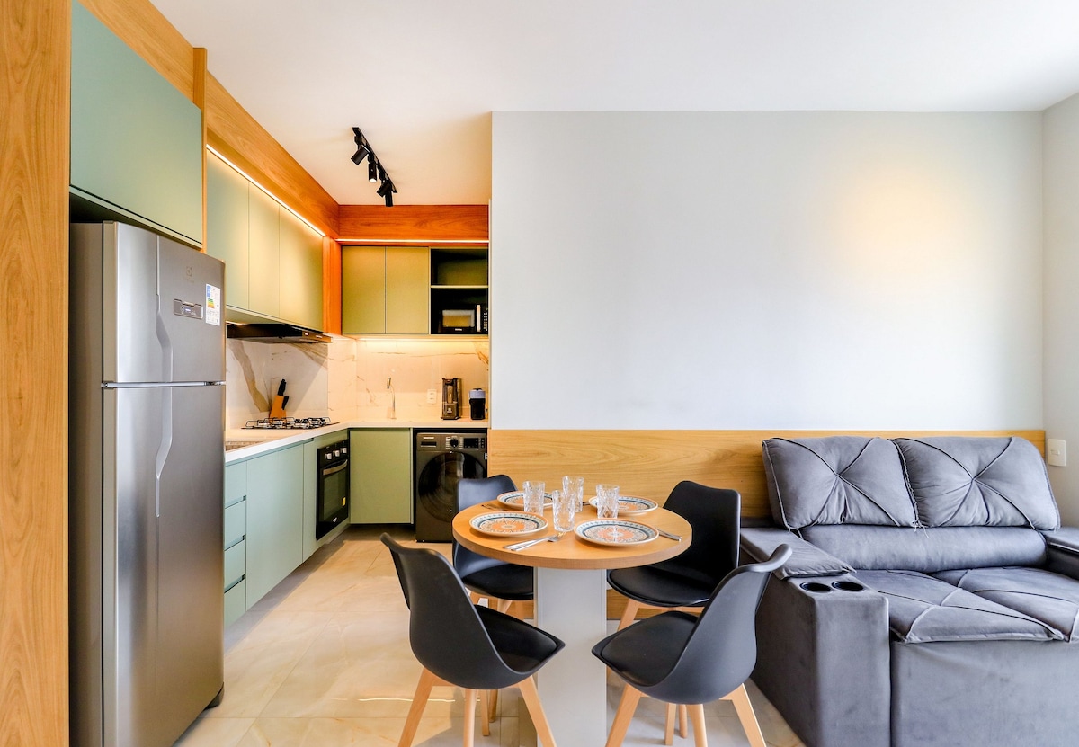 Studio de 36m² com estilo industrial e clima aconchegante, ideal para curtas ou longas estadias. Possui cozinha completa, ar-condicionado, internet rápida e TV 43”. Localização excelente: 5 minutos a pé do Shopping Ibirapuera e do Metrô Eucaliptos. Condomínio moderno com academia e lazer completo. Próximo ao Parque Ibirapuera e a 5 minutos de carro do Aeroporto de Congonhas. Perfeito para quem busca conforto, praticidade e estilo em São Paulo.