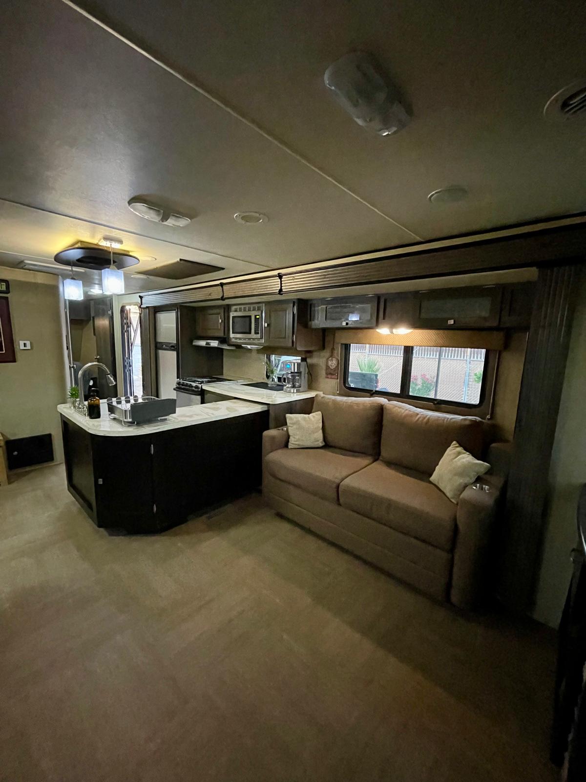 ಮನೆ-ಪ್ಲಶ್ ಆಸನ, ಪೂರ್ಣ ಅಡುಗೆಮನೆ, 2 ಎಸಿ ಘಟಕಗಳು, 51" ಟಿವಿ ಮತ್ತು ಬಾತ್ರೂಮ್ನ ಎಲ್ಲಾ ಸೌಕರ್ಯಗಳೊಂದಿಗೆ ಈ ಆರಾಮದಾಯಕ 35 ಅಡಿ RV ಯಲ್ಲಿ ಶಾಂತಿಯುತ ವಾಸ್ತವ್ಯವನ್ನು ಆನಂದಿಸಿ. ಸ್ಟ್ರಿಂಗ್ ಲೈಟ್ಗಳೊಂದಿಗೆ ಮಬ್ಬಾದ ಒಳಾಂಗಣದ ಕೆಳಗೆ ವಿಶ್ರಾಂತಿ ಪಡೆಯಿರಿ, ಹ್ಯಾಮಾಕ್ನಲ್ಲಿ ನಿದ್ರಿಸಿ ಅಥವಾ ಹೊರಾಂಗಣದಲ್ಲಿ ಊಟ ಮಾಡಿ. ಒತ್ತಡ-ಮುಕ್ತ ವಿಹಾರಕ್ಕಾಗಿ ಸ್ವಚ್ಛ, ಸ್ತಬ್ಧ ಮತ್ತು ಸಂಪೂರ್ಣವಾಗಿ ಸಂಗ್ರಹಿಸಲಾಗಿದೆ.