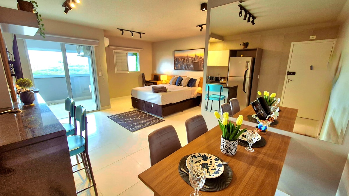 ಬ್ರೆಜಿಲ್ನ ಅತ್ಯುತ್ತಮ ನಗರಕ್ಕೆ ಬಂದು ಅತ್ಯುತ್ತಮ ಅಪಾರ್ಟ್ಮೆಂಟ್ನಲ್ಲಿ ಉಳಿಯಲು ಬಯಸುವಿರಾ? ಆದ್ದರಿಂದ ನೀವು ಸೂಕ್ತವಾದ ಸ್ಥಳವನ್ನು ಕಂಡುಕೊಂಡಿದ್ದೀರಿ. ಈ ವಿಶೇಷ ಸ್ಟುಡಿಯೋ ಎಲ್ಲಾ ಆರಾಮದಾಯಕ ಮತ್ತು ಅತ್ಯಾಧುನಿಕ ವಸ್ತುಗಳನ್ನು ಹೊಂದಿದೆ. ವಾಸ್ತುಶಿಲ್ಪಿ ಬಿಯಾಂಕಾ ಮಹುವಾದ್ ಅವರು ಉತ್ತಮವಾಗಿ ಅಲಂಕರಿಸಿದ್ದಾರೆ ಮತ್ತು ಸಹಿ ಮಾಡಿದ್ದಾರೆ, ಇದು ಸೌಂದರ್ಯ, ಸೊಬಗು ಮತ್ತು ತಂತ್ರಜ್ಞಾನವನ್ನು ಒಂದುಗೂಡಿಸುತ್ತದೆ. 100% ಹತ್ತಿ 300 ಥ್ರೆಡ್ಗಳನ್ನು ಹೊಂದಿರುವ ದೊಡ್ಡ ಹಾಸಿಗೆ? ನಾವು ಅದನ್ನು ಸಹ ಹೊಂದಿದ್ದೇವೆ! ನಿಮ್ಮ ಅನುಭವವು ಅತ್ಯುತ್ತಮವಾಗಿರಲು ಎಲ್ಲವೂ!