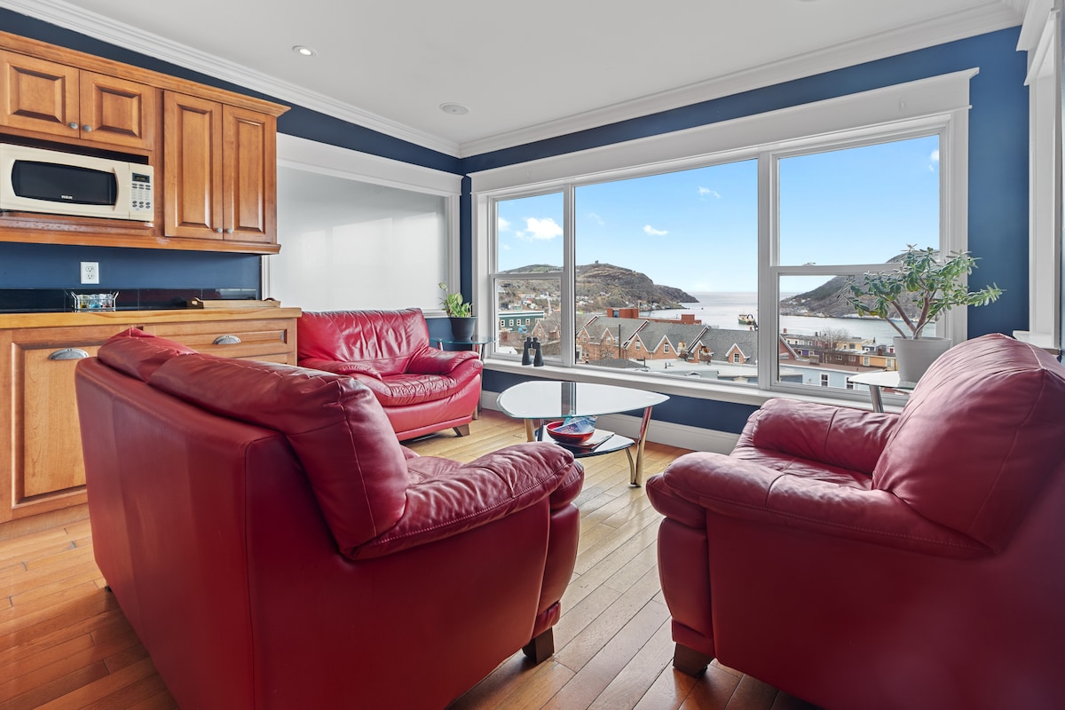 Spectacular 2 bedroom, 2 bathroom Penthouse Suite located in the heart of downtown St. John’s with breathtaking views of the St. John’s harbour. Enjoy a private Outdoor Hot Tub (included), indoor sunroom, sauna in the master ensuite, king and queen bed, fine linens, towels, two smart TV’s in the bedrooms, and a well equipped kitchenette. Off-street Parking included for one vehicle only. Within walking distance from parks, pubs, restaurants, George street, and other historic landmarks.