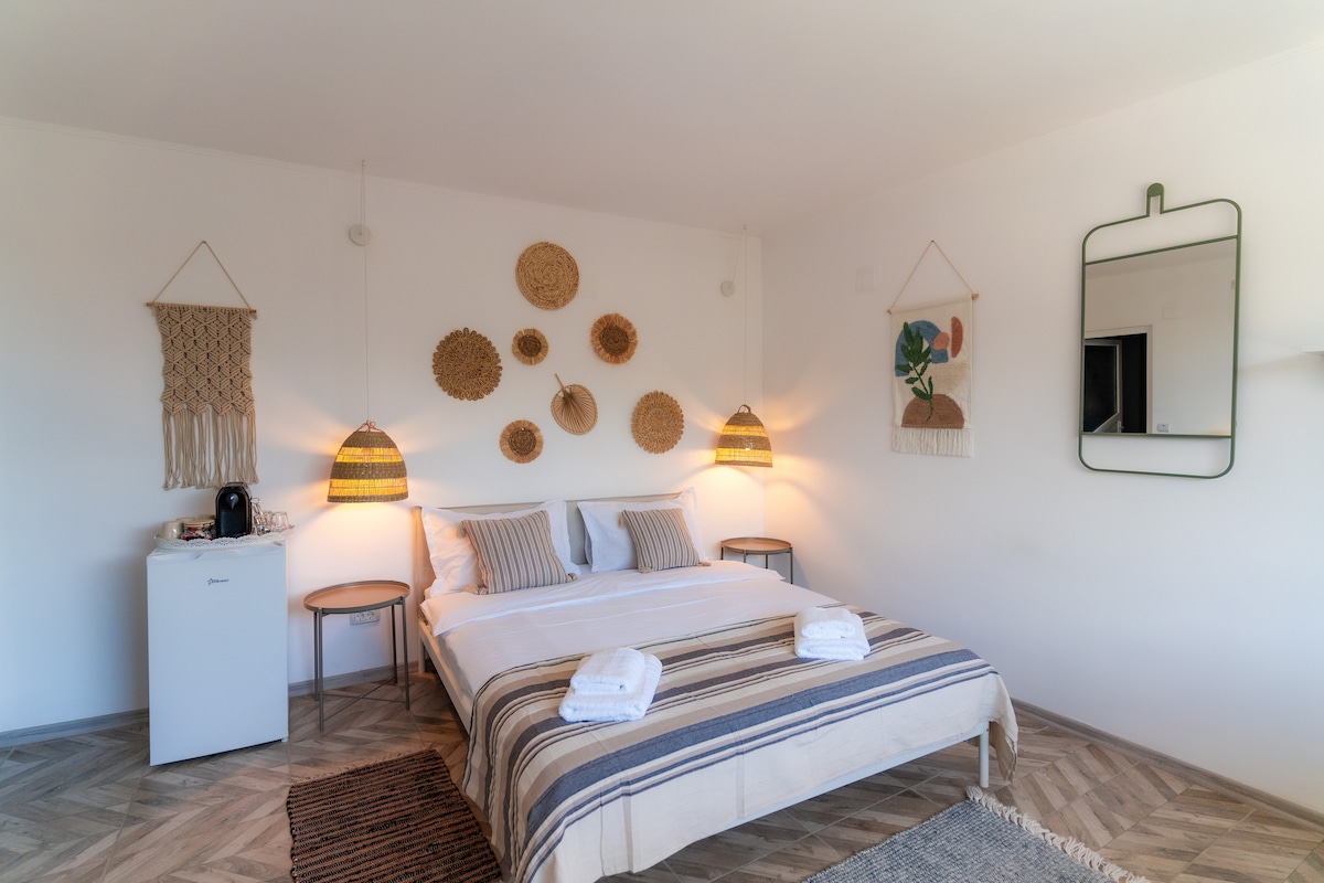 Take it easy at this unique and tranquil getaway. Right on the Corbu beach, where wilderness is still in bloom, admire the nature and relax away from the busy city life. Our garden-view double room is the perfect option for you, combining comfort and premium amenities, while fully embracing the quietness of the green and cozy yard. Begin your mornings by savoring a cup of freshly brewed coffee on the outside patio and let the rays of sunshine guide you throughout the day.