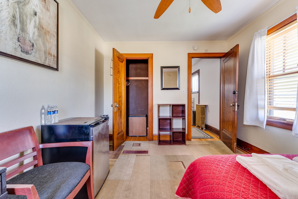 Welcome to our charming 3rd-floor studio located within a Victorian home in the heart of the NE Arts district! This cozy retreat boasts an abundance of natural light streaming in through skylights, illuminating a space adorned with beautiful plants, creating a serene and inviting ambiance. This delightful haven features a warm fireplace perfect for cozying up on chilly evenings. Please note, there is some low clearance near the head of the bed and in the bathroom/kitchen area.