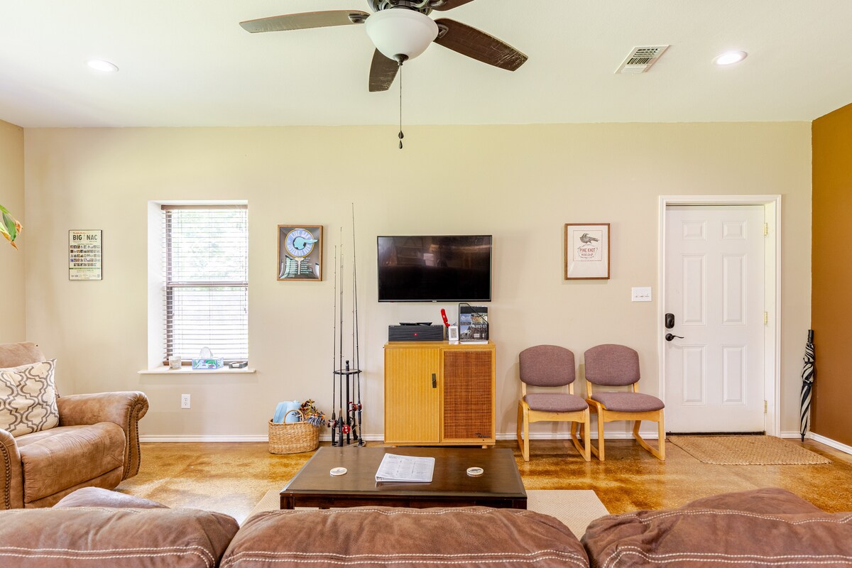 ಪೂರ್ವ ಟೆಕ್ಸಾಸ್ನ ಪಿನಿ ಕಾಡಿನಲ್ಲಿರುವ ಮರಗಳ ಮೂಲಕ ಖಾಸಗಿ ಸರೋವರದ ನೋಟವನ್ನು ಹೊಂದಿರುವ ತನ್ನದೇ ಆದ ಖಾಸಗಿ ಪ್ರವೇಶ ಮತ್ತು ಪ್ರೈವೇಟ್ ಡೆಕ್ ಹೊಂದಿರುವ ಫಾರ್ಮ್ಹೌಸ್-ವಿಷಯದ ಗೆಸ್ಟ್ ಅಪಾರ್ಟ್ಮೆಂಟ್ ಅನ್ನು ನಾವು ಹೊಂದಿದ್ದೇವೆ. ರೂಮ್ ಹೊಚ್ಚ ಹೊಸ ಉಪಕರಣಗಳು ಮತ್ತು ಕಾಫಿ ಬಾರ್ ಅನ್ನು ಒಳಗೊಂಡಿದೆ. ತುಂಬಾ ಆರಾಮದಾಯಕವಾದ ಕಿಂಗ್-ಗಾತ್ರದ ಹಾಸಿಗೆ ಮತ್ತು ಅಡಗುತಾಣದ ಹಾಸಿಗೆ ಇದೆ. ಸಾಕಷ್ಟು ಕ್ಲೋಸೆಟ್ ಸ್ಥಳವಿದೆ. ಅಡುಗೆಮನೆಯು ಸಂಪೂರ್ಣವಾಗಿ ಪಾತ್ರೆಗಳು ಮತ್ತು ಪಾತ್ರೆಗಳಿಂದ ತುಂಬಿದೆ. ಲಾಂಡ್ರಿ ರೂಮ್ ಅನ್ನು ಸಹ ಪ್ರವೇಶಿಸಬಹುದು. ಈ ಲಿಸ್ಟಿಂಗ್ ನನ್ನ ಮನೆಗೆ ಲಗತ್ತಿಸಲಾಗಿದೆ ಆದರೆ ನಾವು ಶಾಂತ ನೆರೆಹೊರೆಯವರು!