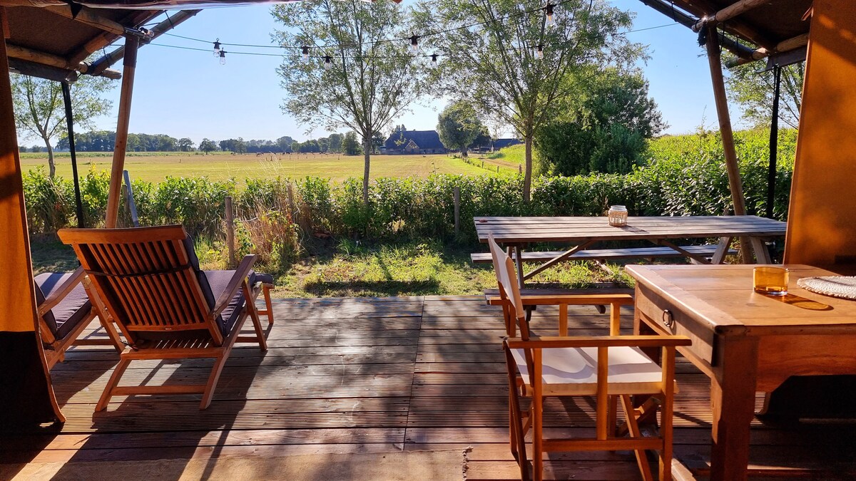 ಹುಲ್ಲುಗಾವಲಿನ ಮಧ್ಯದಲ್ಲಿ ಬೆಚ್ಚಗಿನ ಐಷಾರಾಮಿ ಸಫಾರಿ ಟೆಂಟ್.