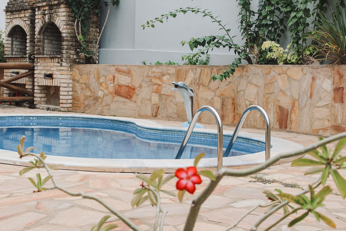 ಪೂಲ್, ಬಾರ್ಬೆಕ್ಯೂ ಮತ್ತು ಗ್ಯಾರೇಜ್ ಹೊಂದಿರುವ ಮನೆ ಮೋಡಿ
